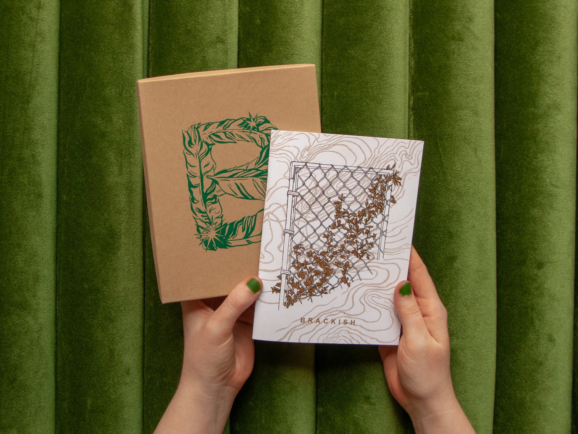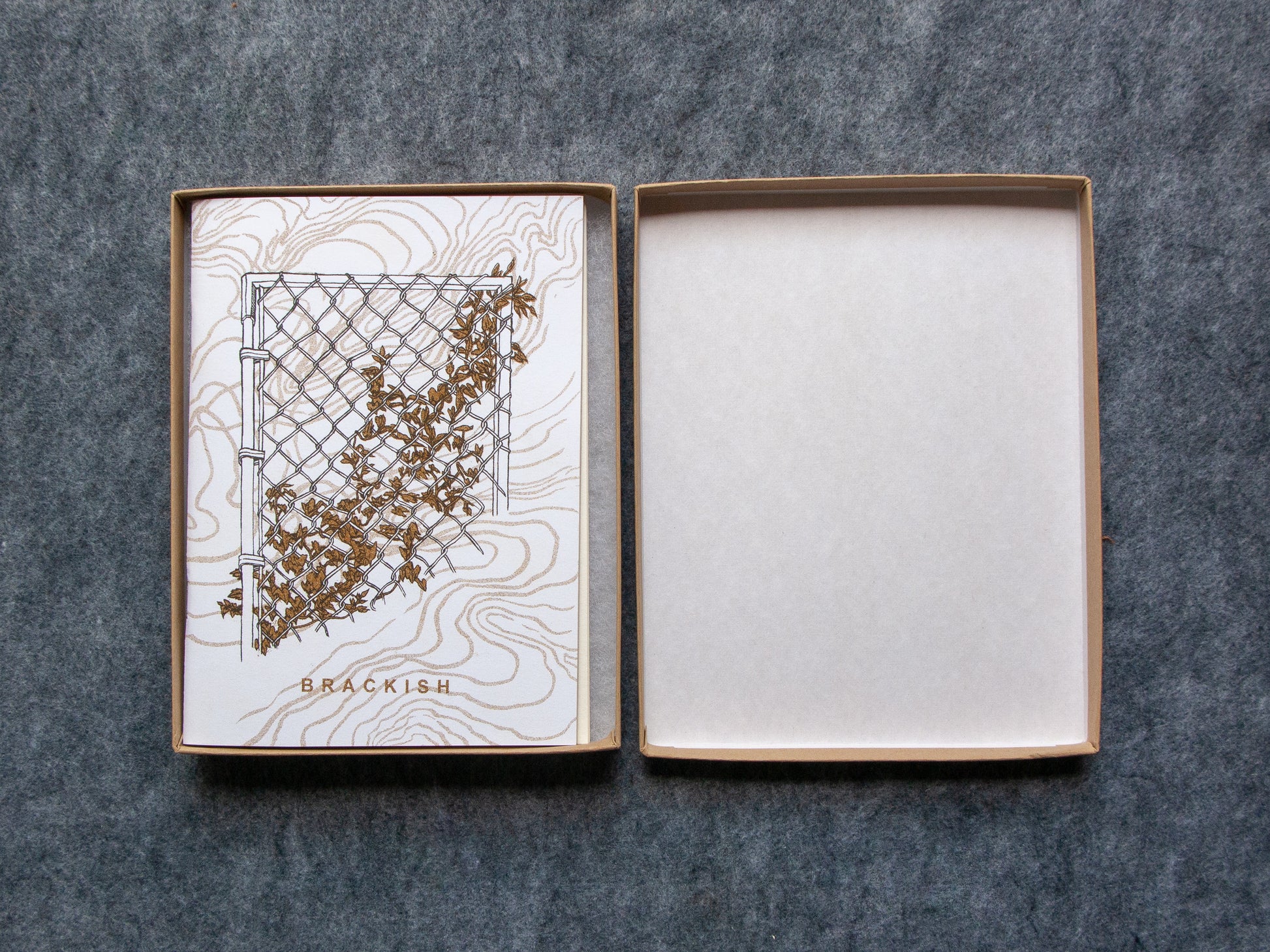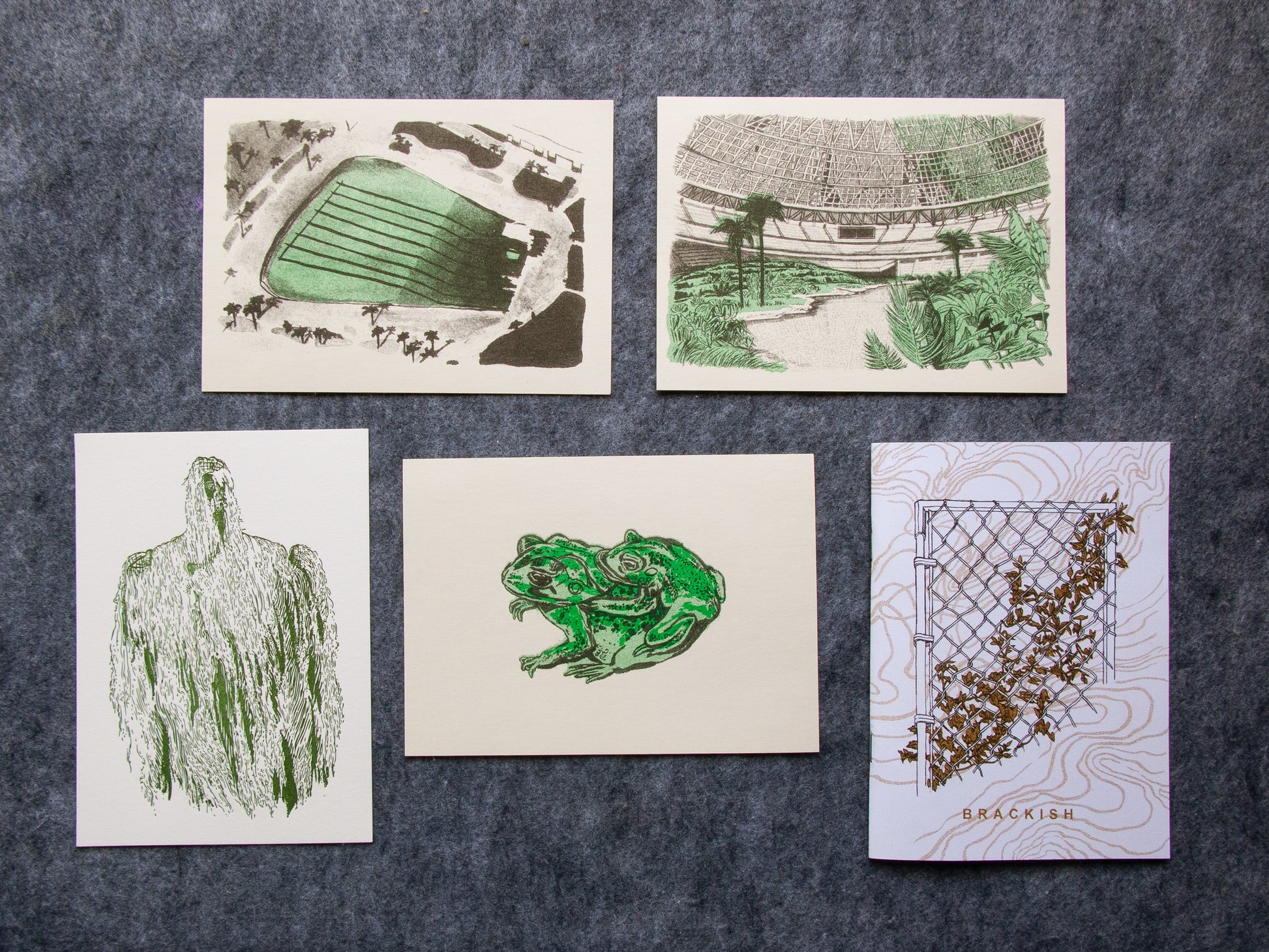 Brackish is a zine project made by Houston based artists Katie Mulholland and Sarah Welch. Over a five month period, Mulholland and Welch created a massive pile of ink drawings. These drawings show the past, present, and sometimes invented future of the Houston landscape. They curated this drawing collection to create the Brackish zine. Drawings of special interest were chosen to become risograph or letterpress prints paired alongside the book. The book features local and invasive plants & animals, architecture, interior spaces, city infrastructure, industry, and residential scenes. Special attention is lavished on locations with ancient, and sometimes futuristic presence. Think 2001: A Space Odyssey meets Jurassic Park.
