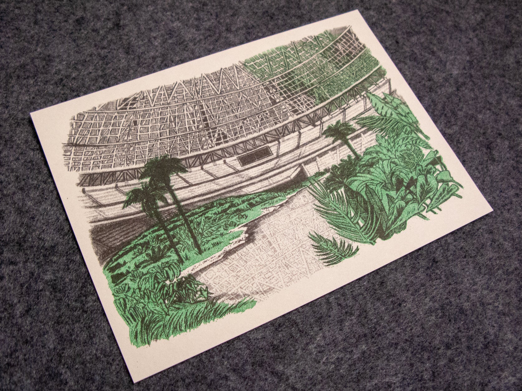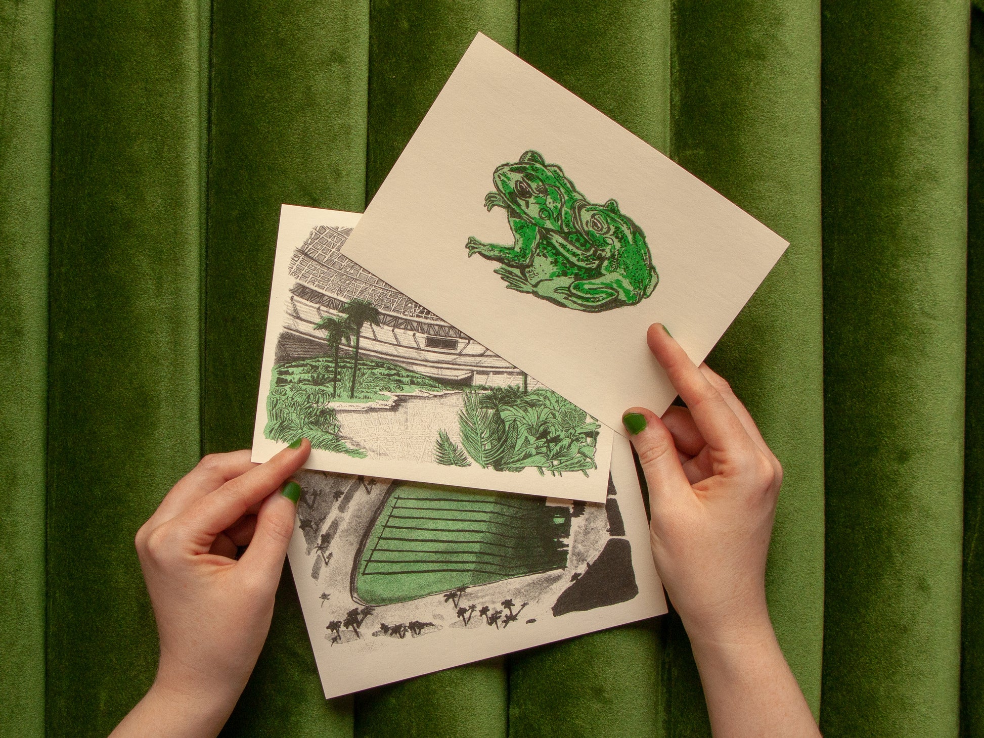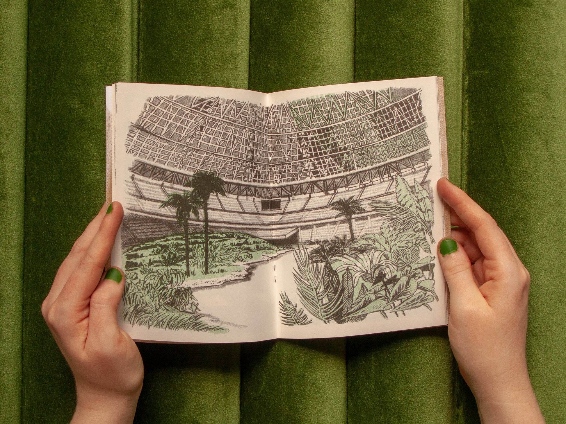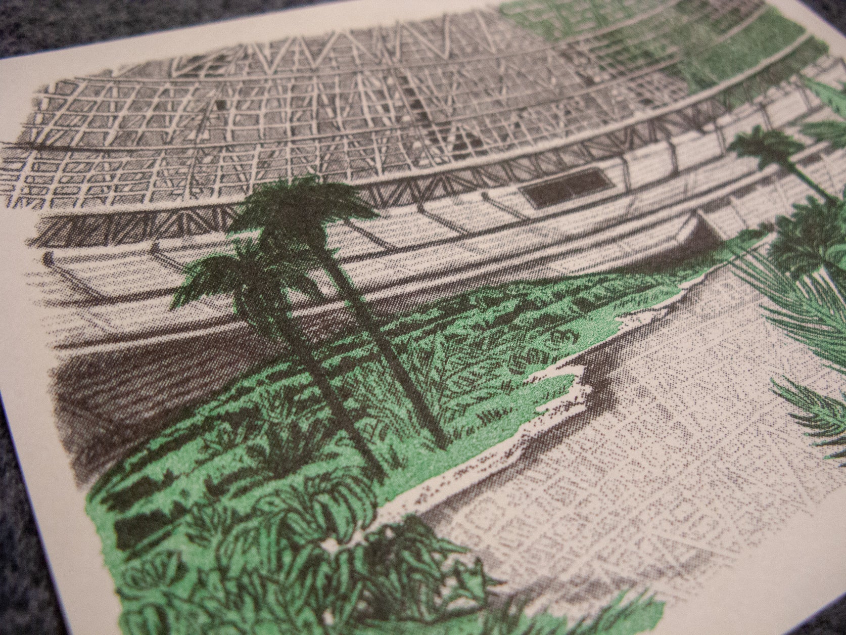 Brackish is a zine project made by Houston based artists Katie Mulholland and Sarah Welch. Over a five month period, Mulholland and Welch created a massive pile of ink drawings. These drawings show the past, present, and sometimes invented future of the Houston landscape. They curated this drawing collection to create the Brackish zine. Drawings of special interest were chosen to become risograph or letterpress prints paired alongside the book. The book features local and invasive plants & animals, architecture, interior spaces, city infrastructure, industry, and residential scenes. Special attention is lavished on locations with ancient, and sometimes futuristic presence. Think 2001: A Space Odyssey meets Jurassic Park.