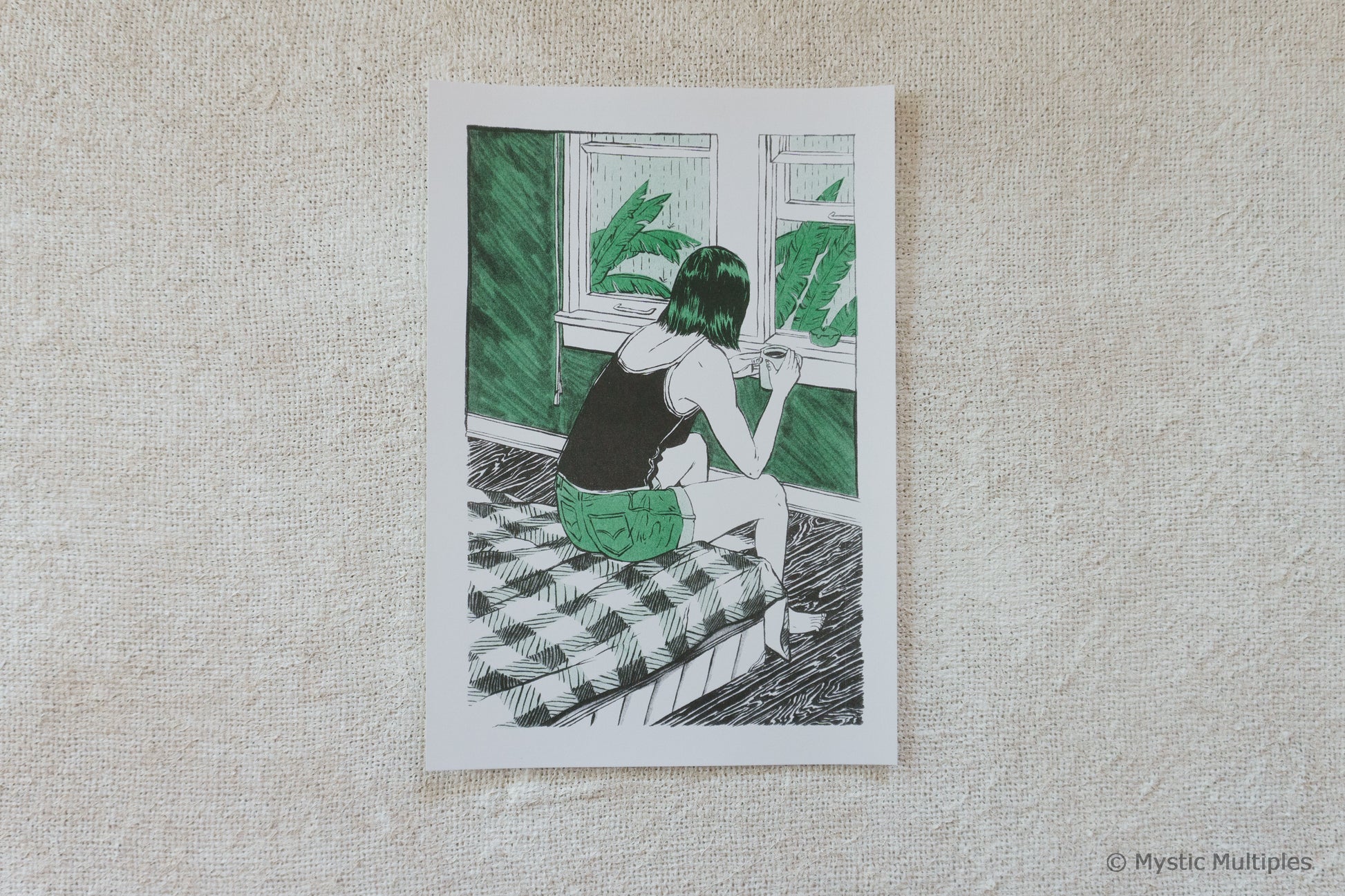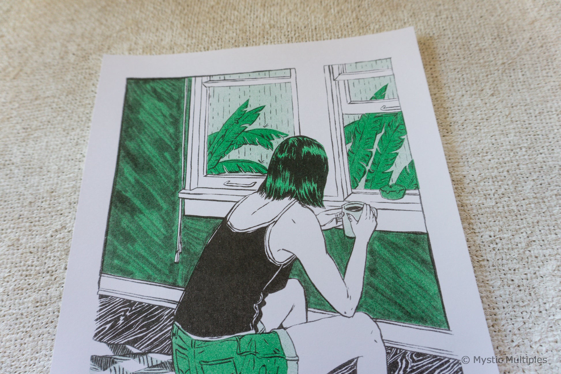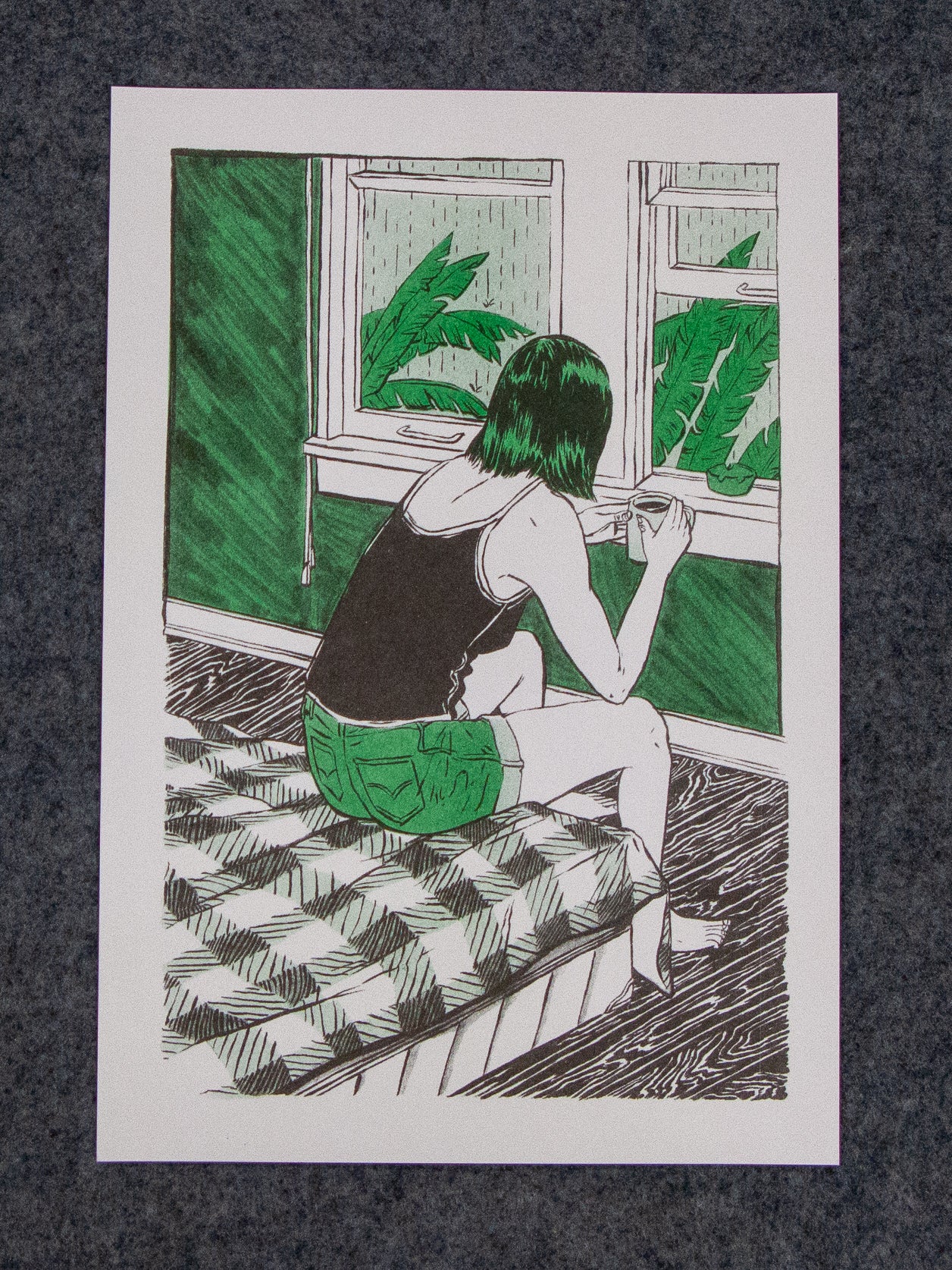 Here we find beloved protagonist, Jess, from our comic, Endless Monsoon. When the world is dark and drippy, why resist? Indulge in a broody cup of hot beverage and do yourself a big ol ennui.