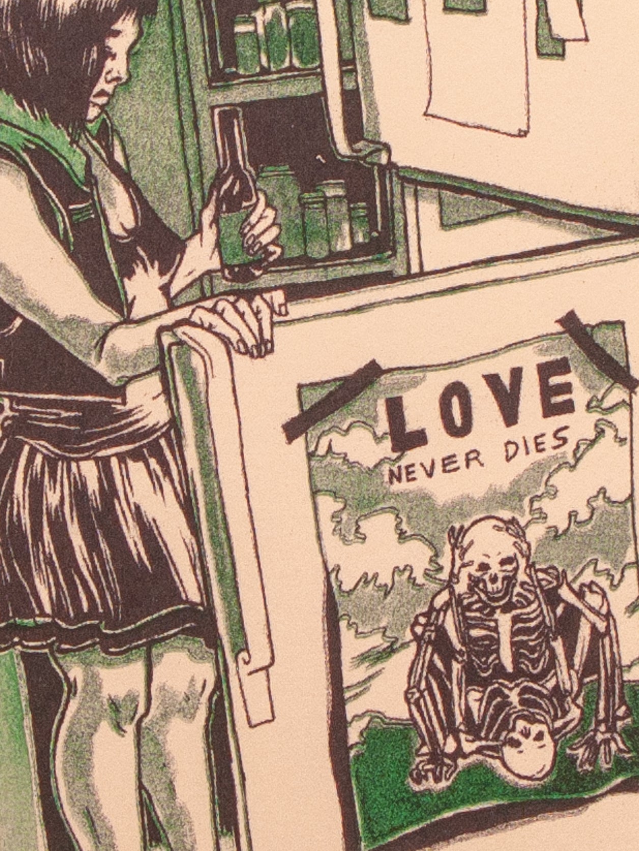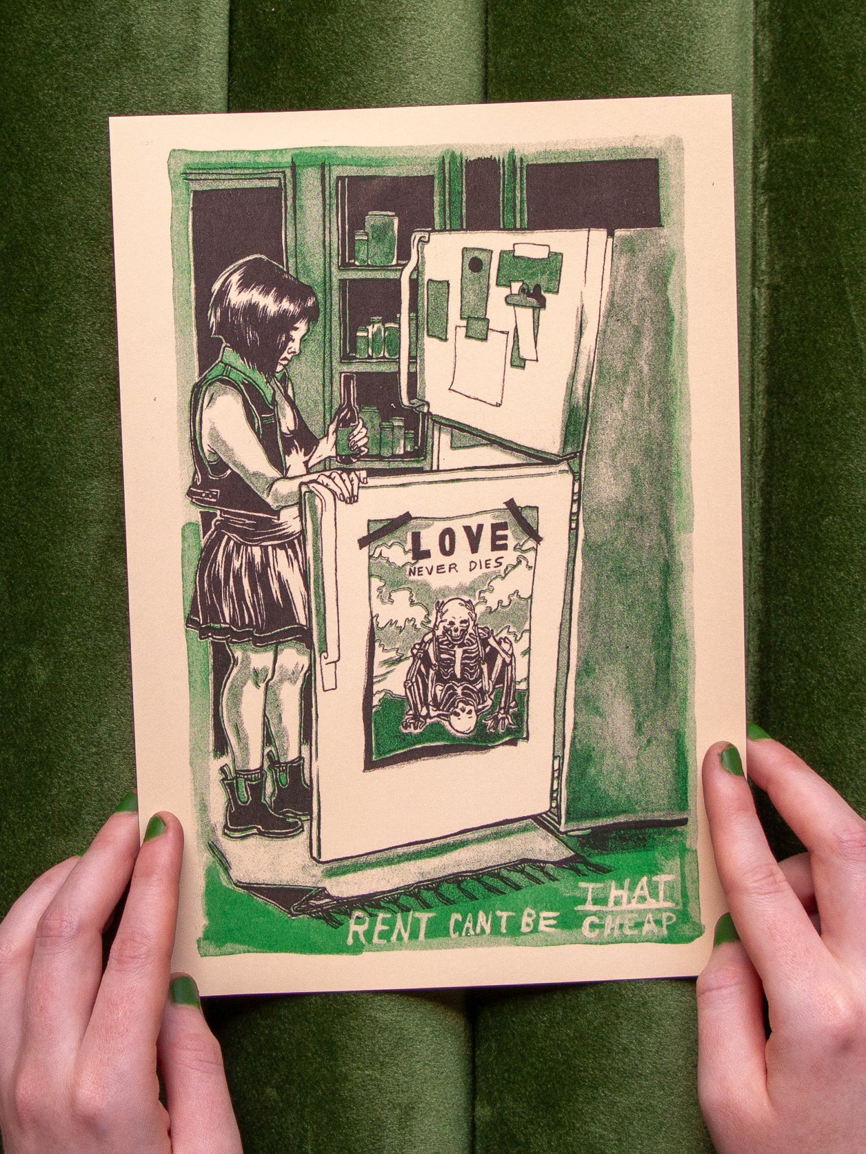 The things we have endured in the pursuit of cheap--nay, affordable--rent. Truly unspeakable. This risograph art print was originally a page from our comic book, Endless Monsoon. It was also later adapted into a screen printed gigposter for music act, Kurt Vile. Perhaps you saw it on a merch table somewhere? When you look at this image I hope you think about the first apartment you ever had. Have a good cry-laugh.