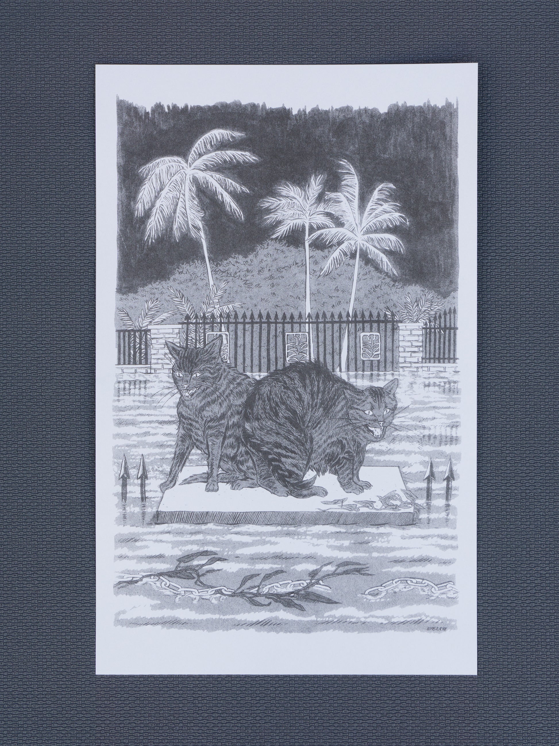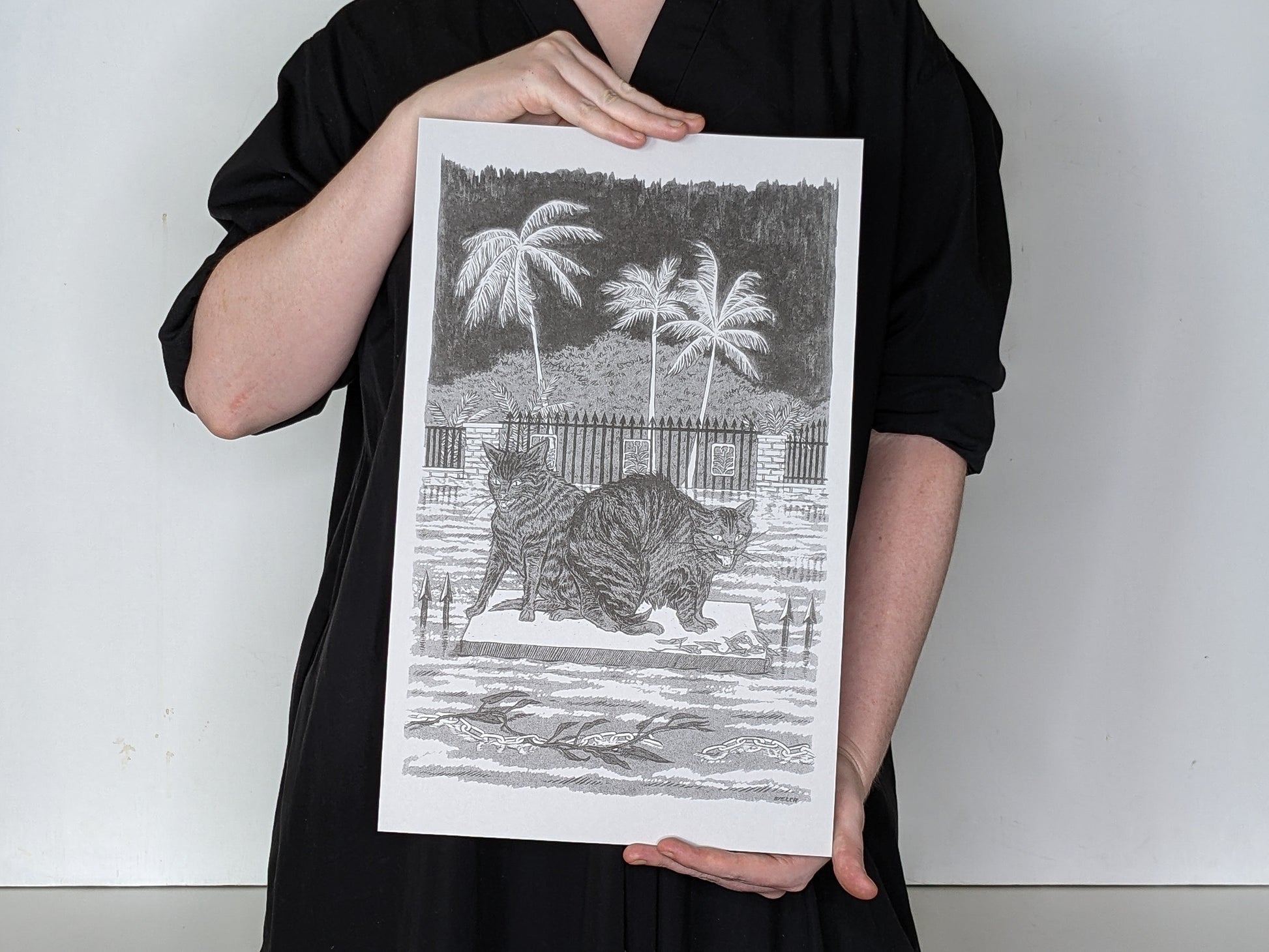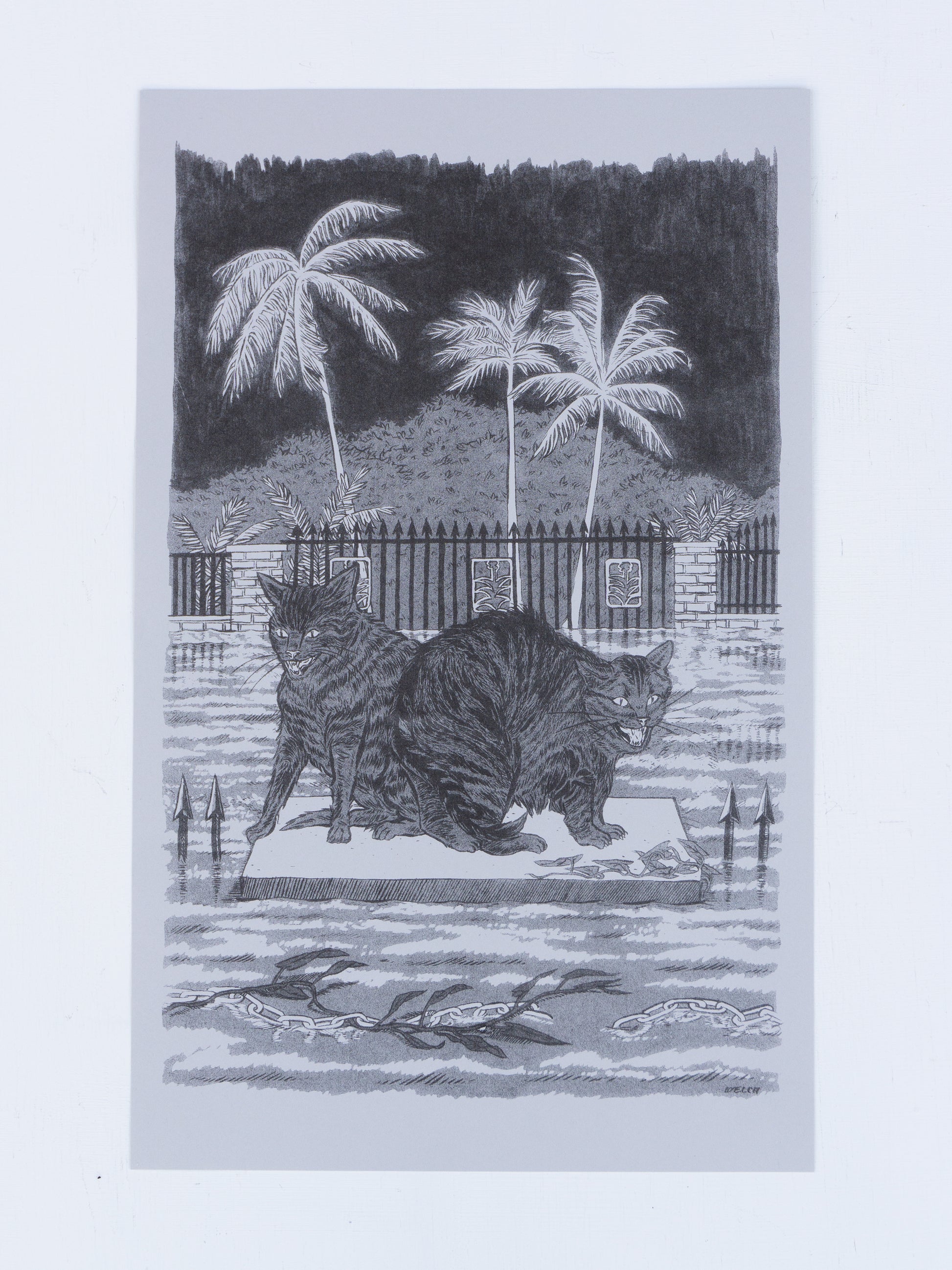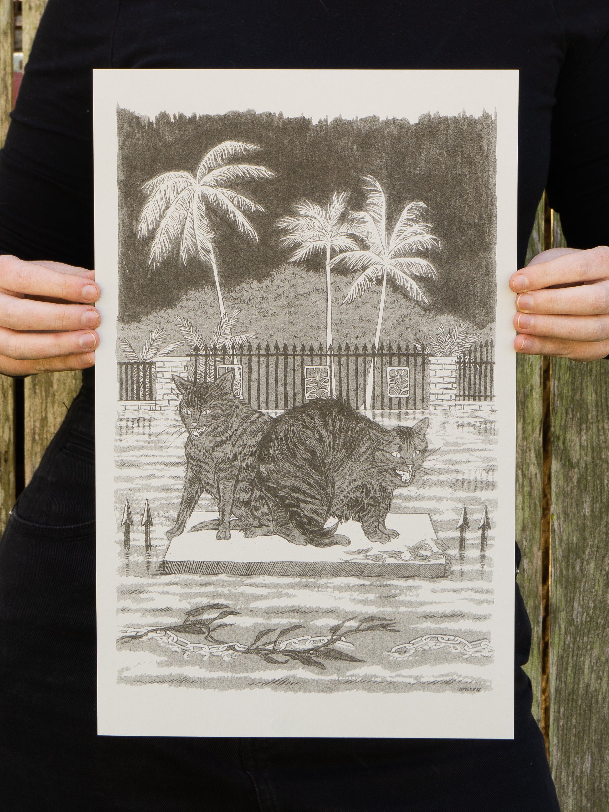This riso art print is a companion piece to our "Holdouts" series of comics and zines. Originally produced for a reading room installation at Wesleyan University, the print imagines two cats freaked out by the flooding caused by rapid climate change. http://www.sarahwelch.info/holdoutsolinreadingroom