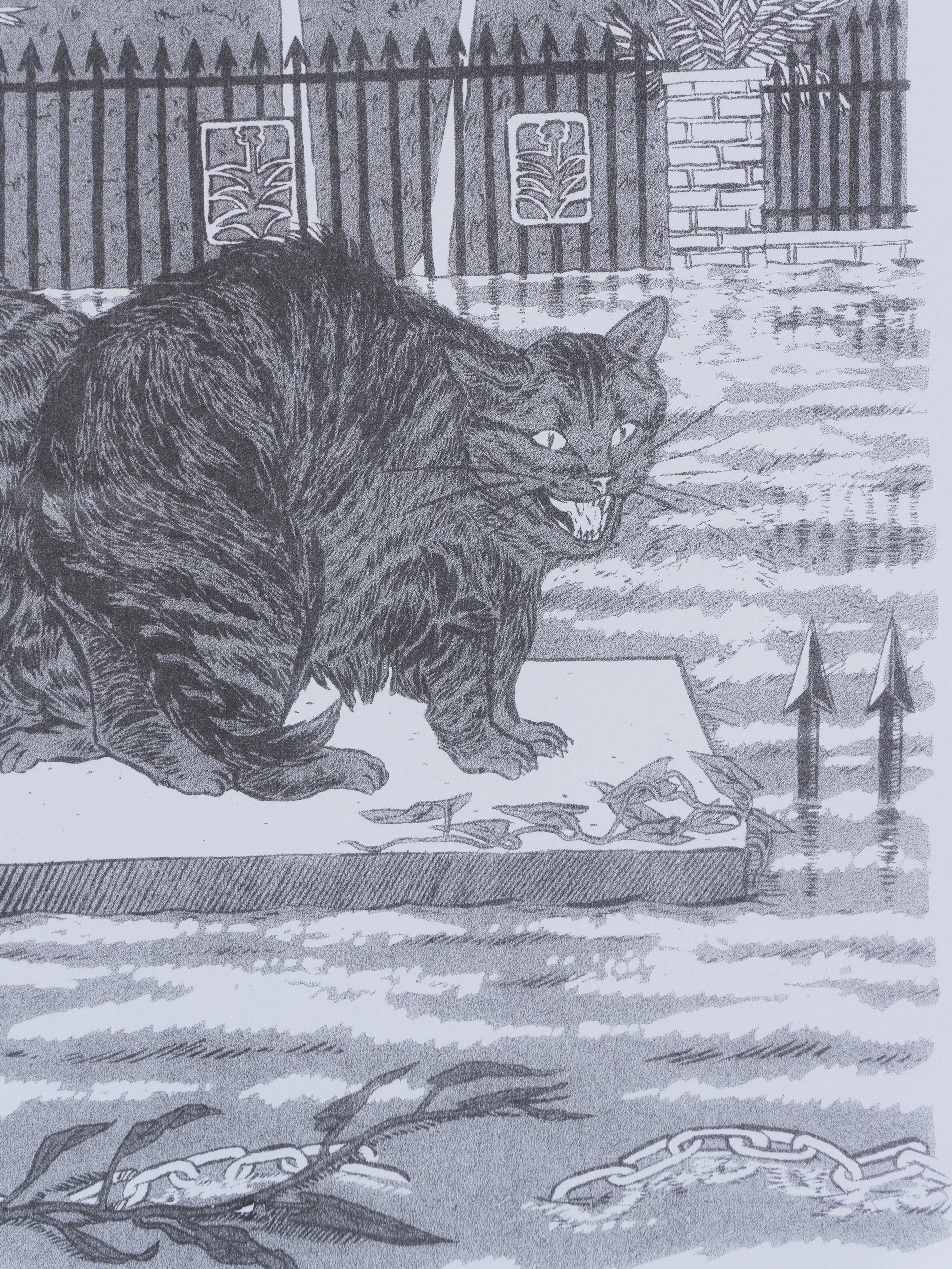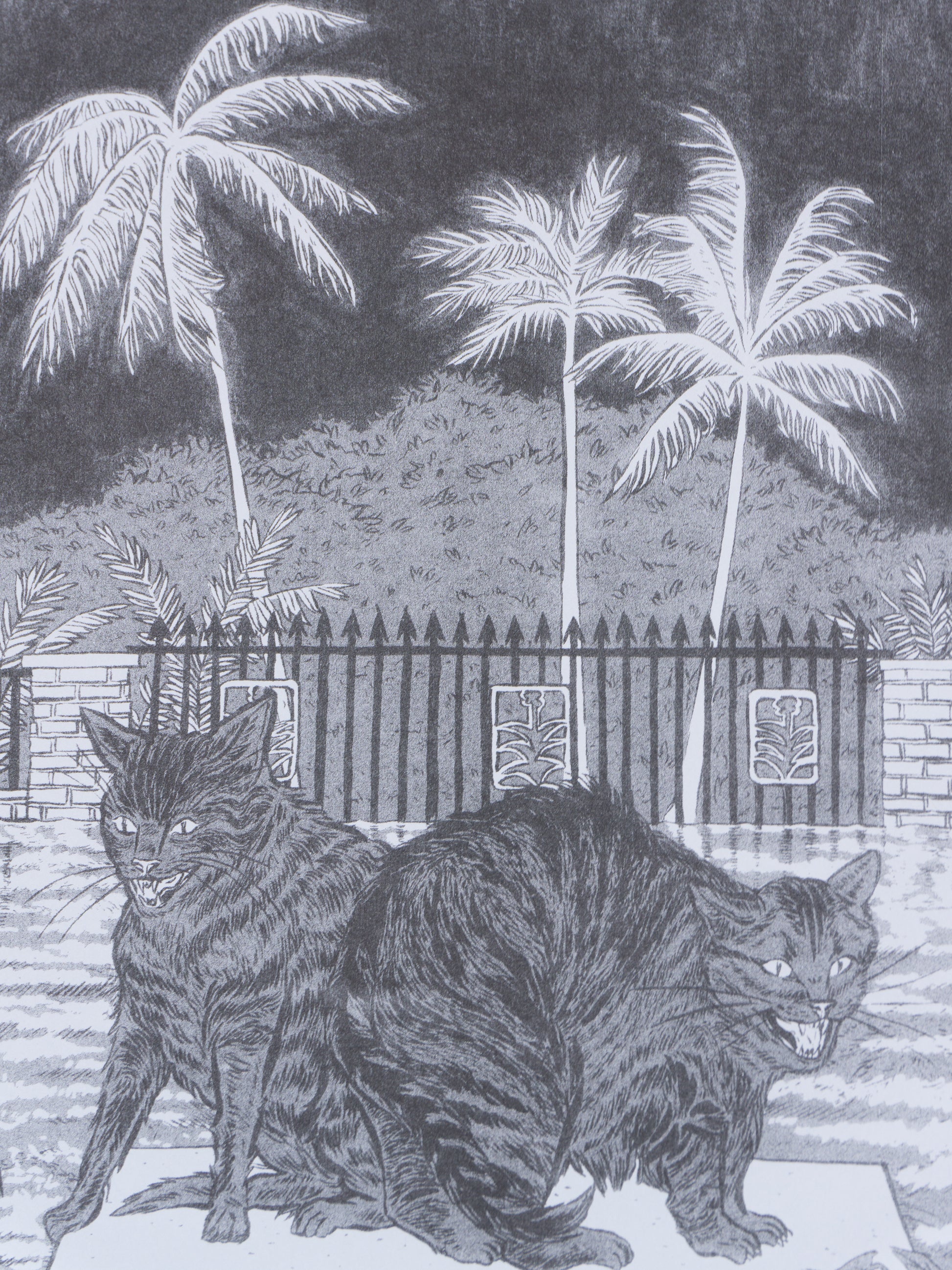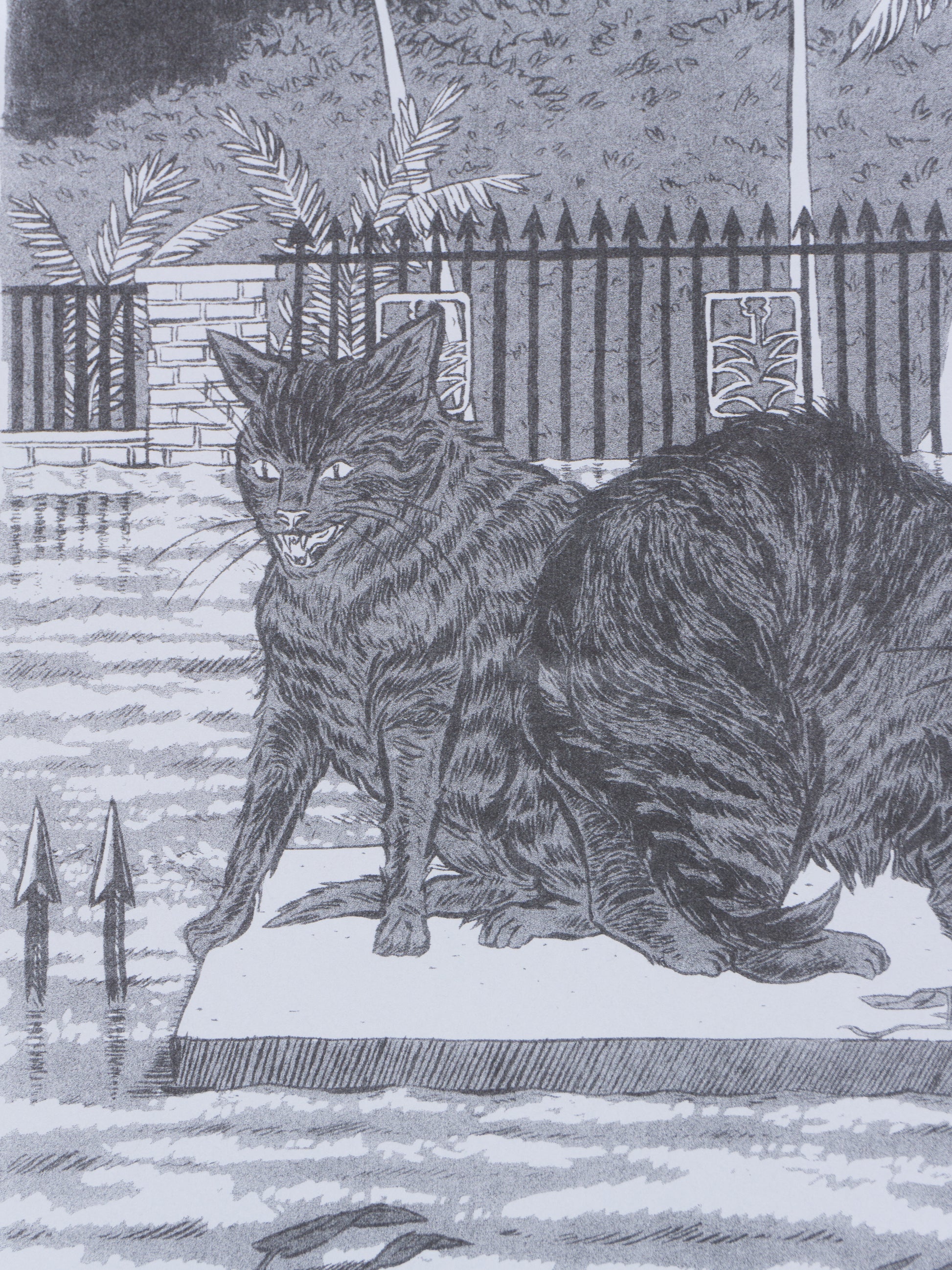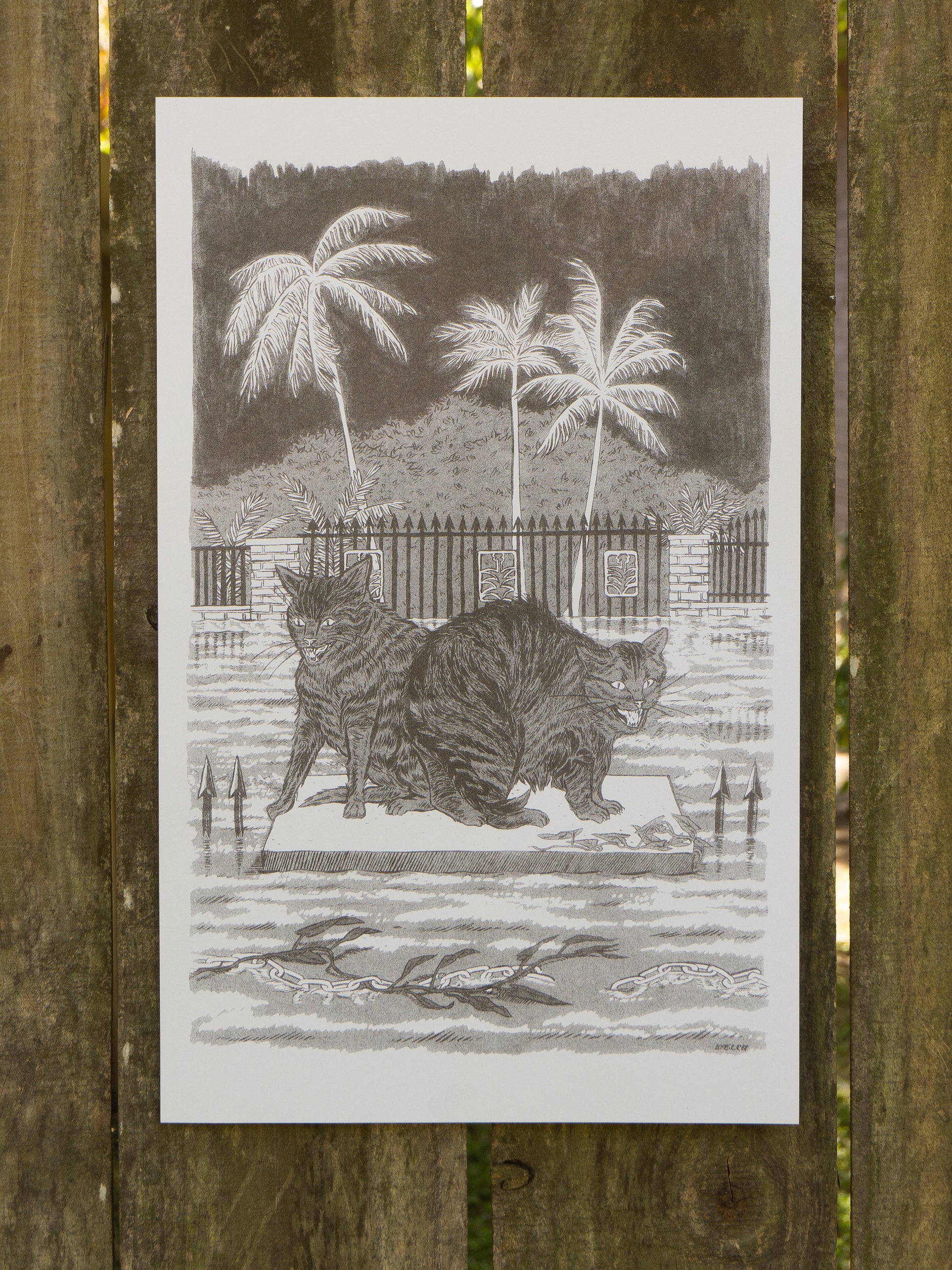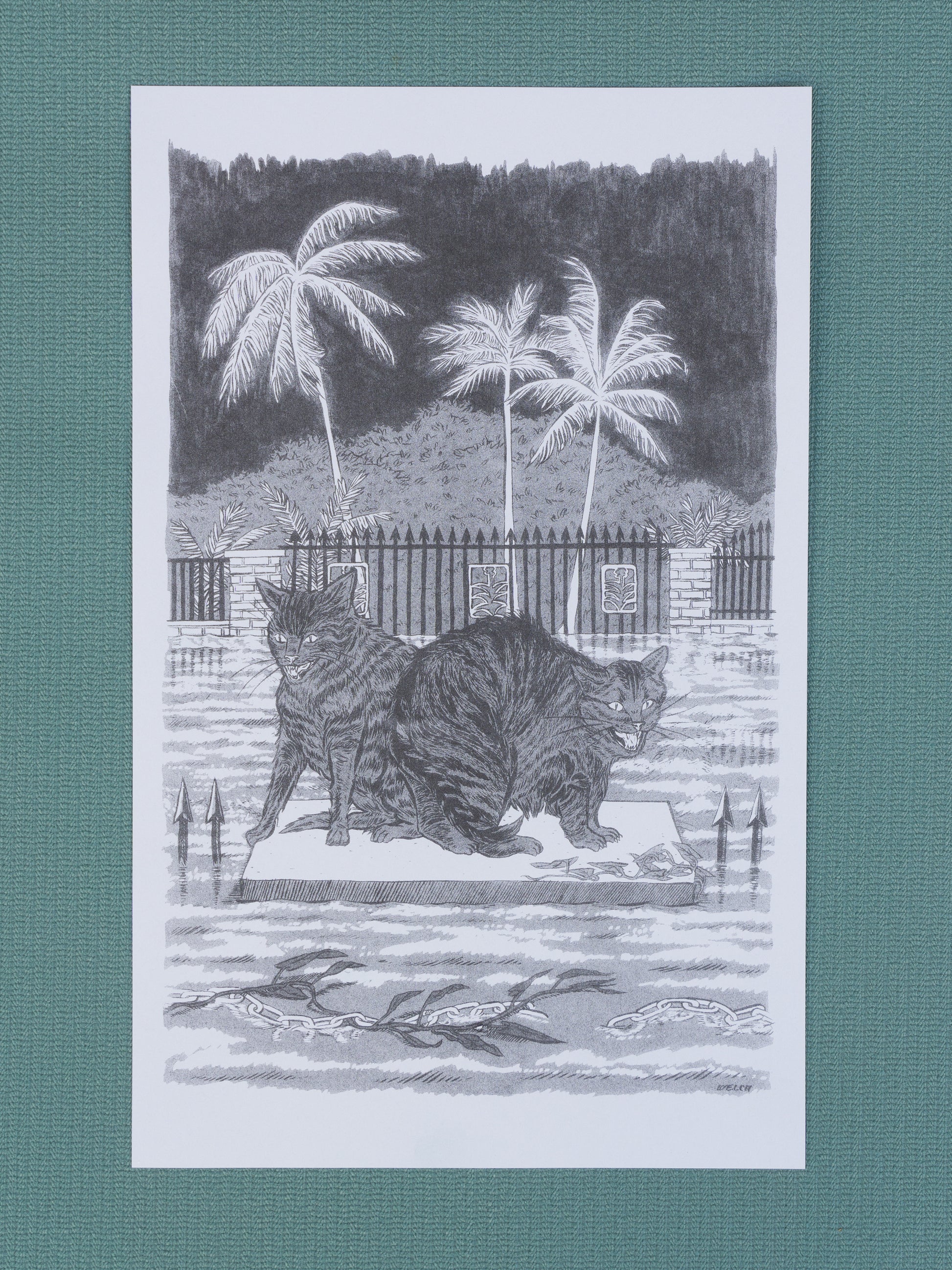 This riso art print is a companion piece to our "Holdouts" series of comics and zines. Originally produced for a reading room installation at Wesleyan University, the print imagines two cats freaked out by the flooding caused by rapid climate change. http://www.sarahwelch.info/holdoutsolinreadingroom