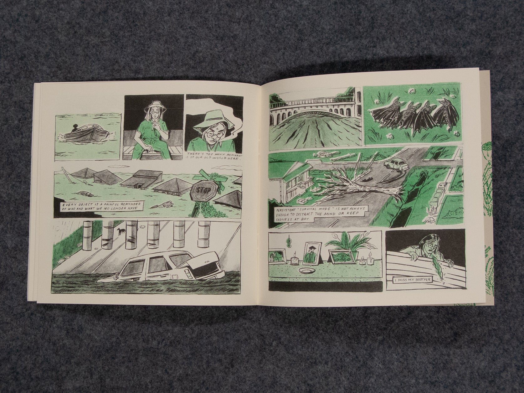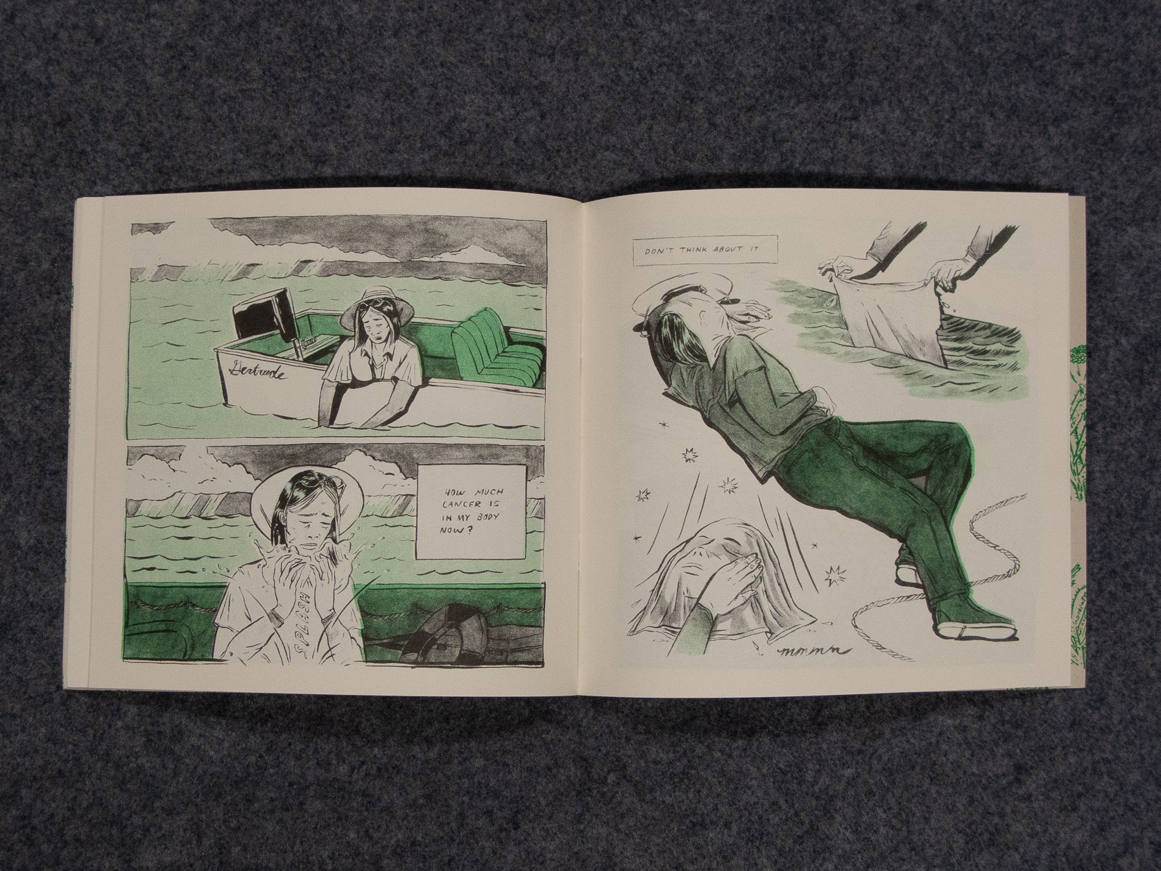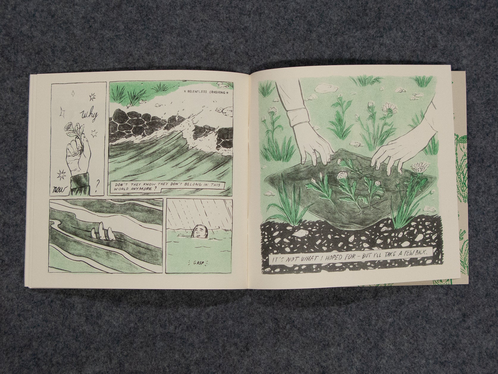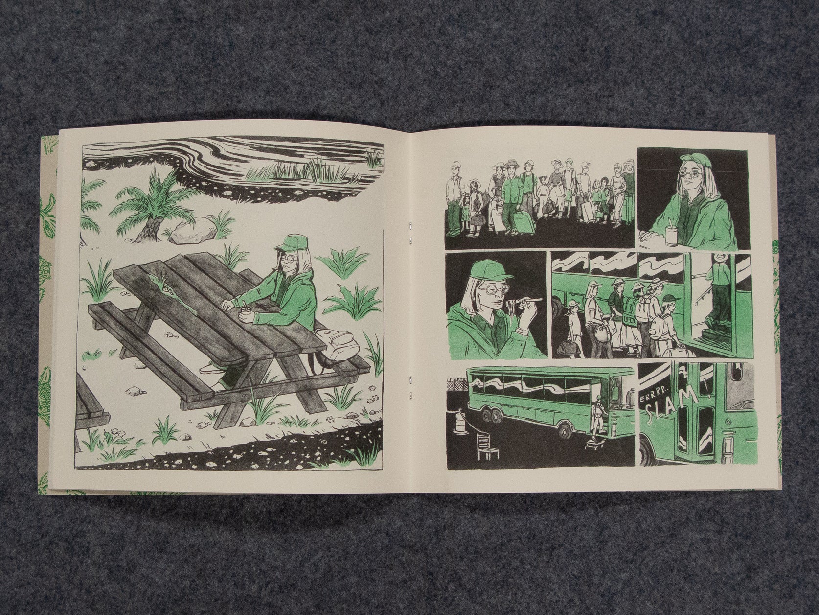- Risograph printed on on 60# / 89gsm cream text and 80# / 219gsm old green cover papers