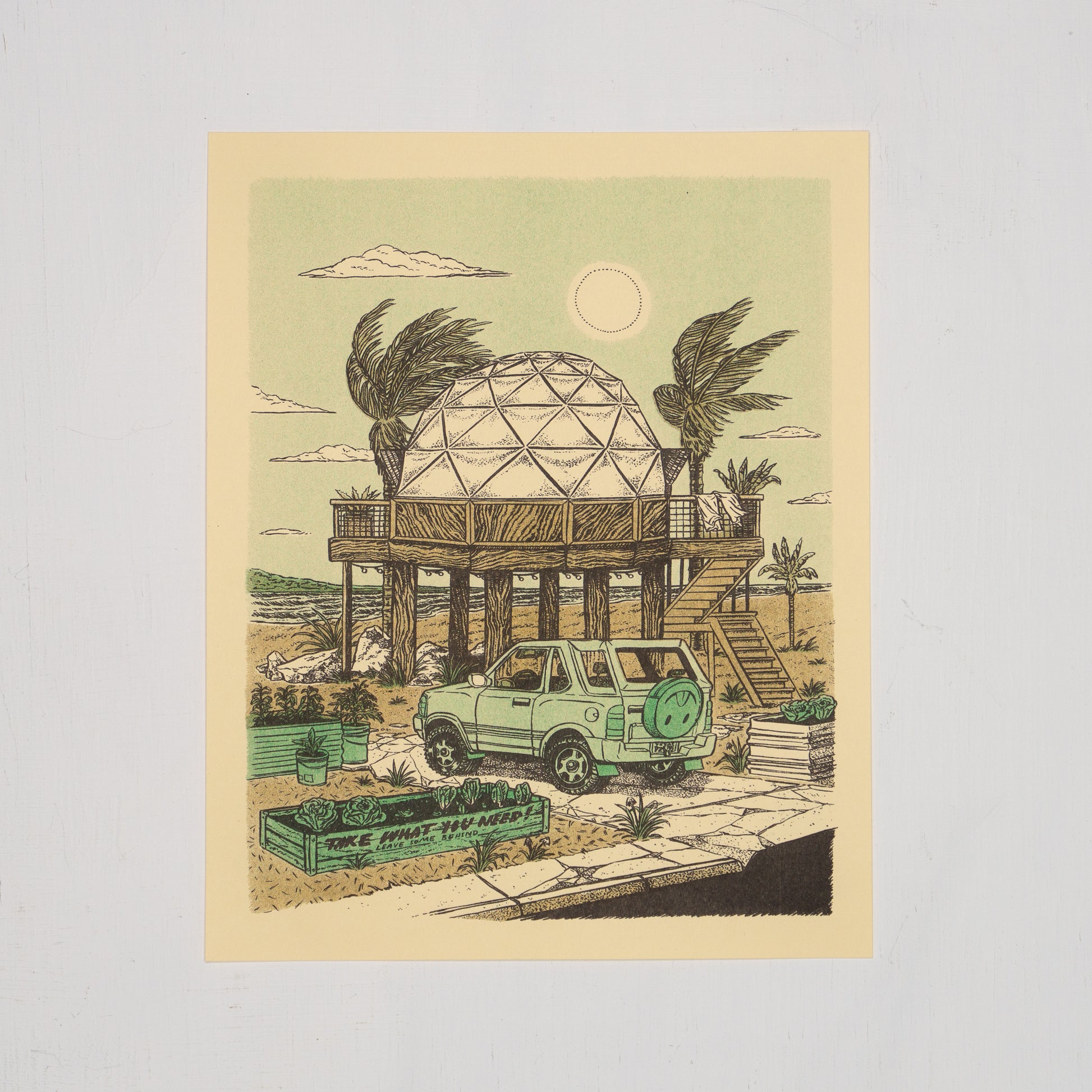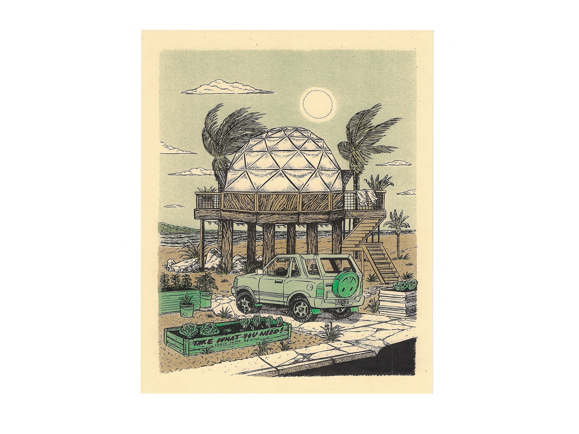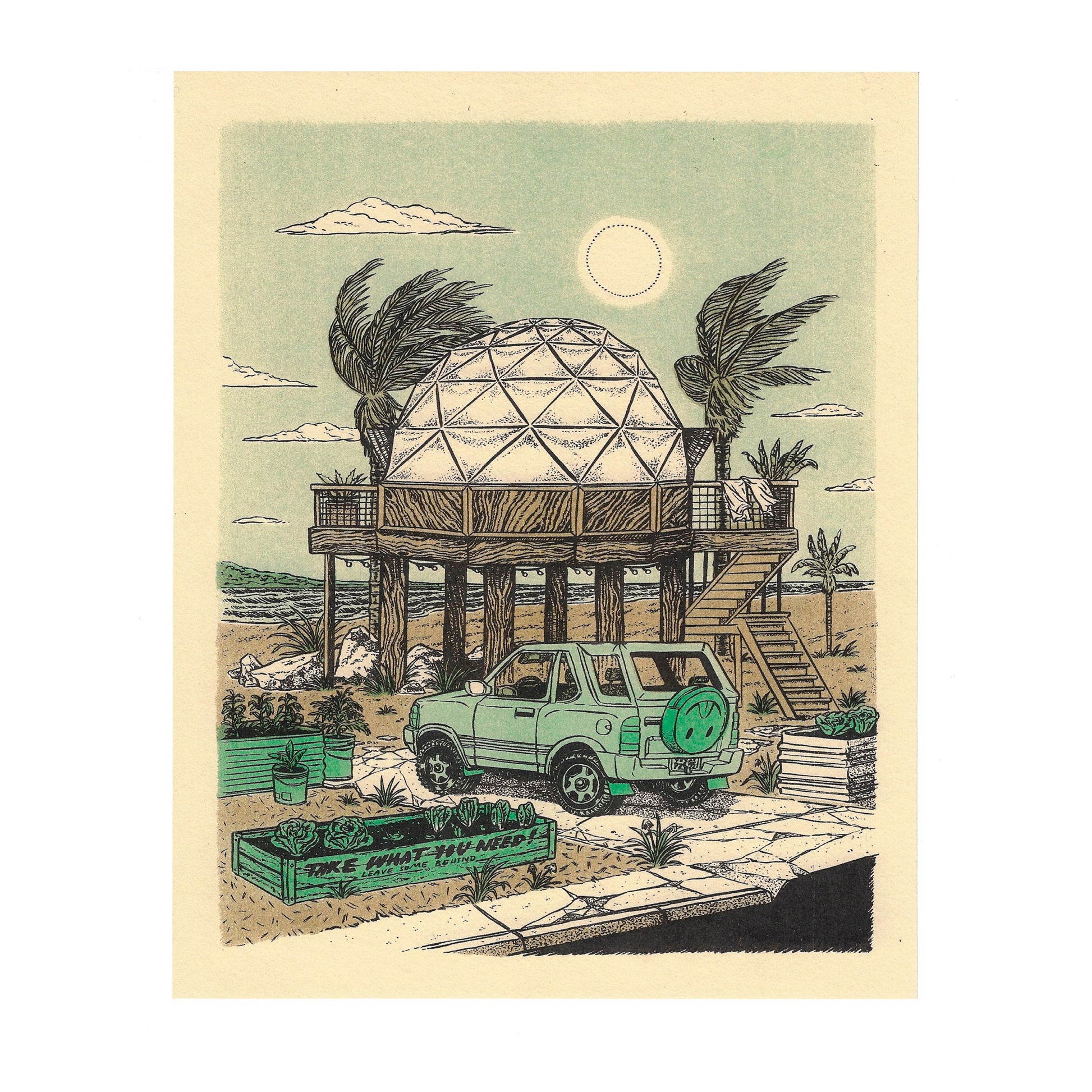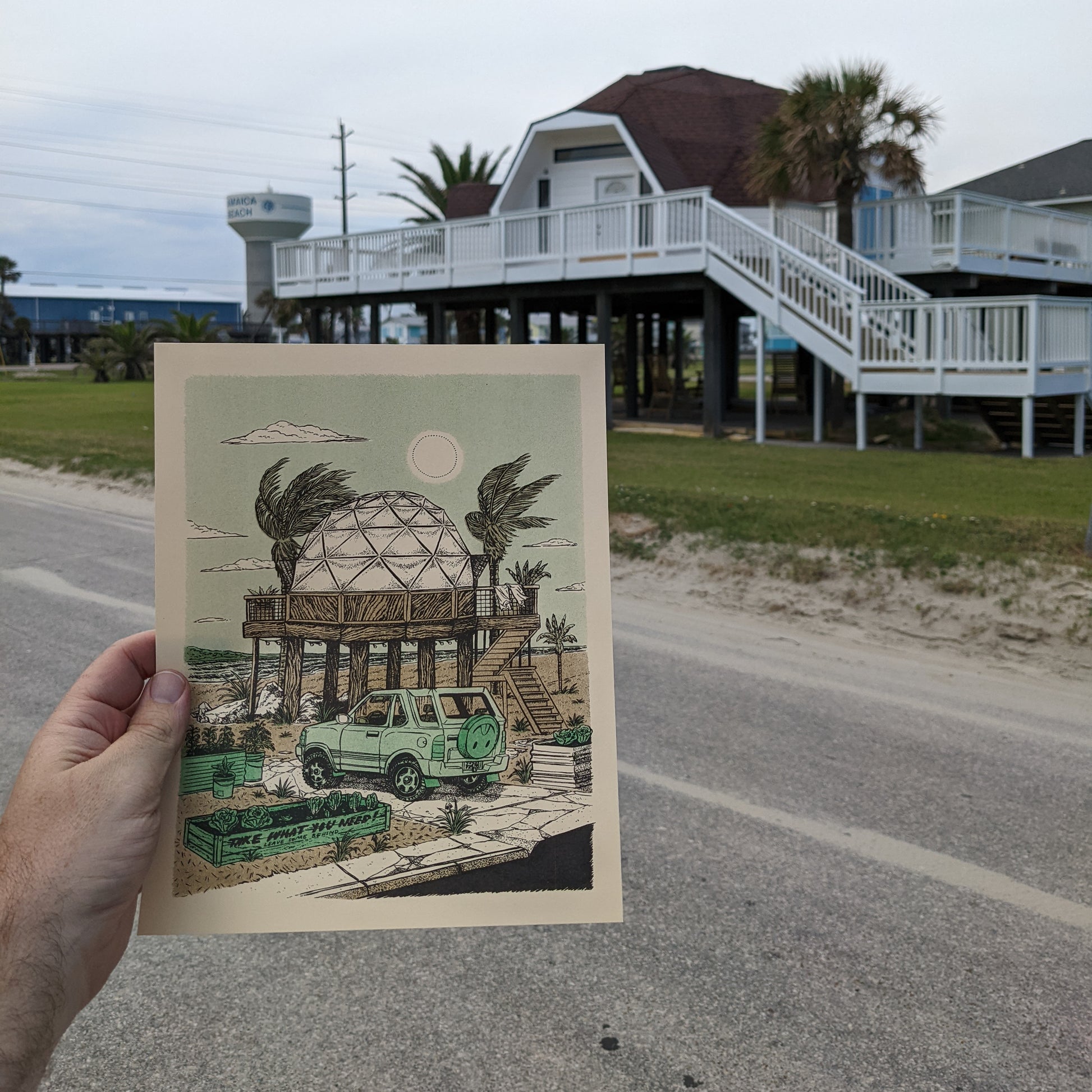 Raised up high in the air, just out of reach of the incoming tides sits a geodesic dome home. Dome-shaped buildings are known to be more resistant to the high speed winds of hurricanes. Unfortunately domes which are made from conventional materials, "stick-built,' are also prone to leaking at the joints. Let's hope these folks have some nice, well sealed joints. On the breezy Saturday afternoon illustrated here all is well: The Amigo is parked in the drive, the tomatoes and greens are thriving and if you amble down the sidewalk you are free to take what you need. Just leave some behind for your others neighbors. Maybe start your own sidewalk veg garden. Heck, grow it in bucket. Who's gonna stop you?