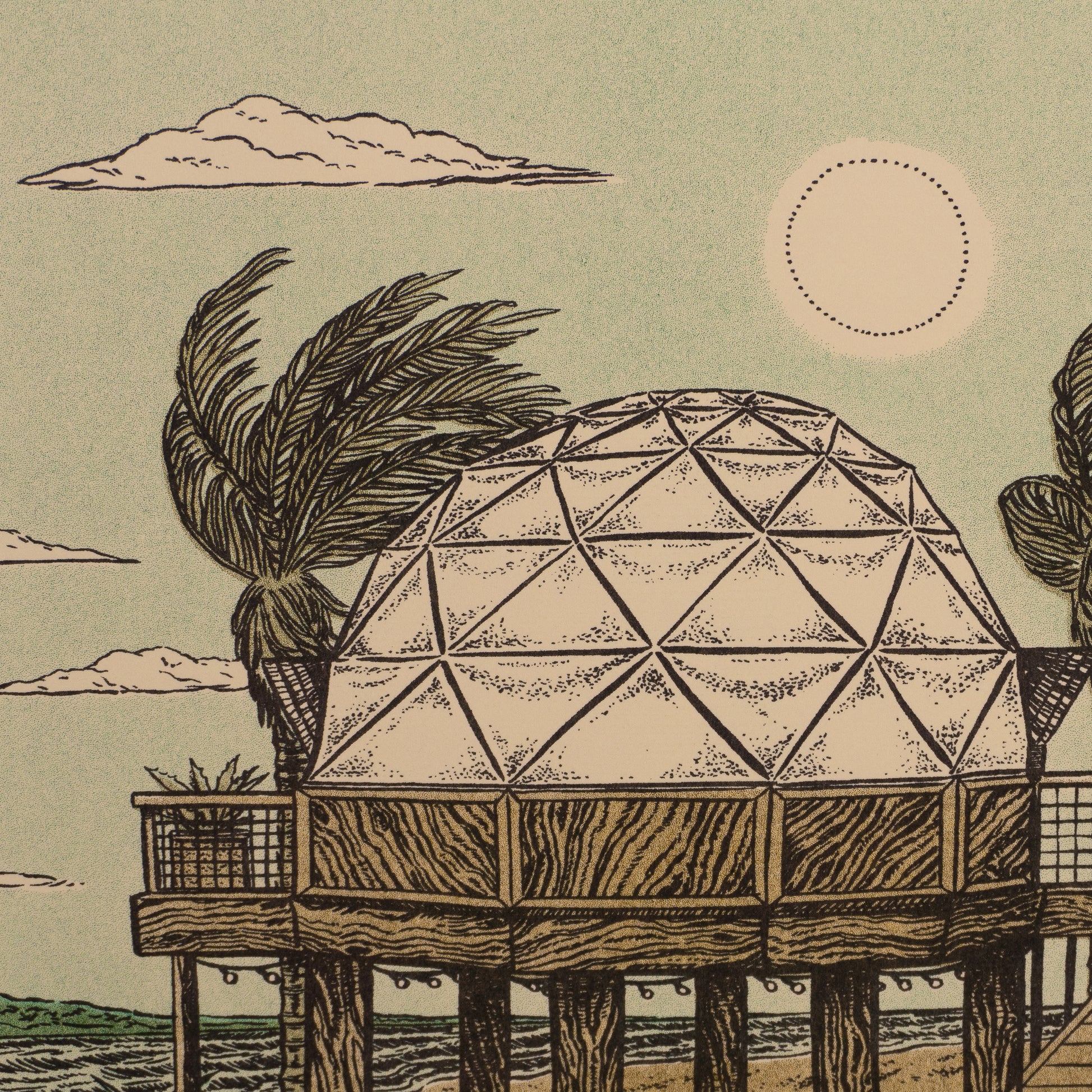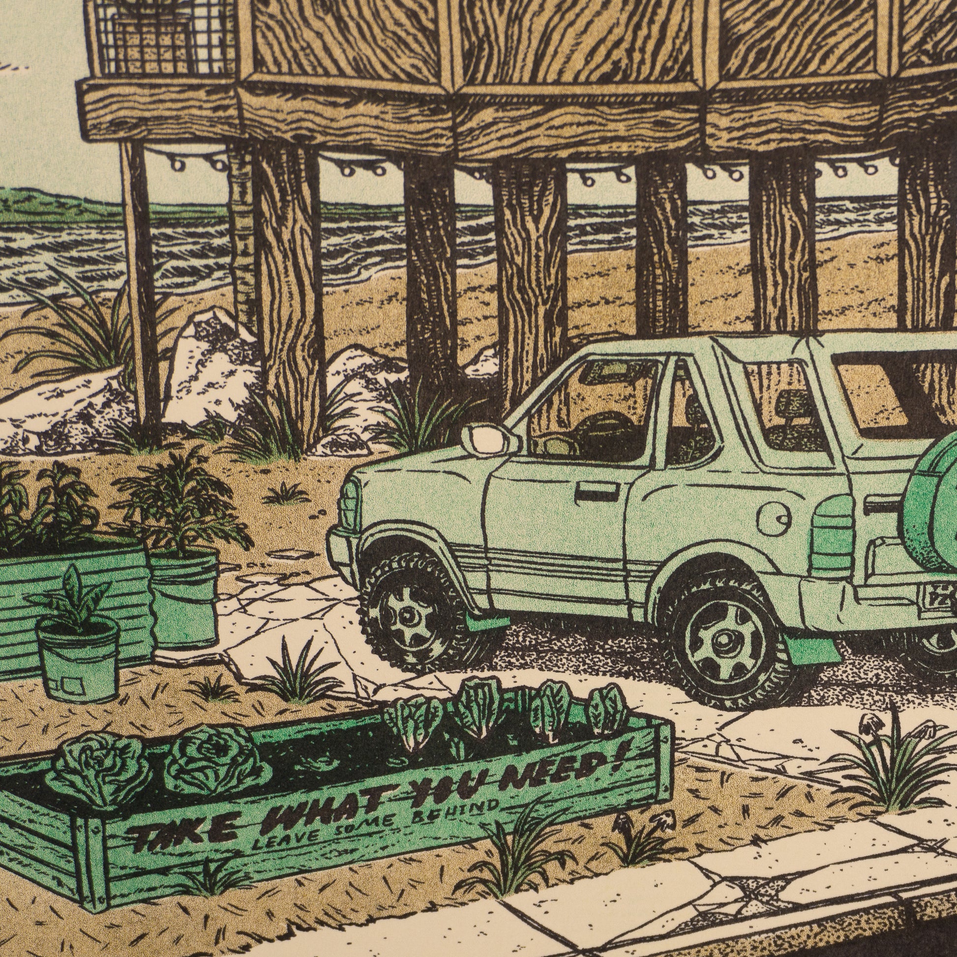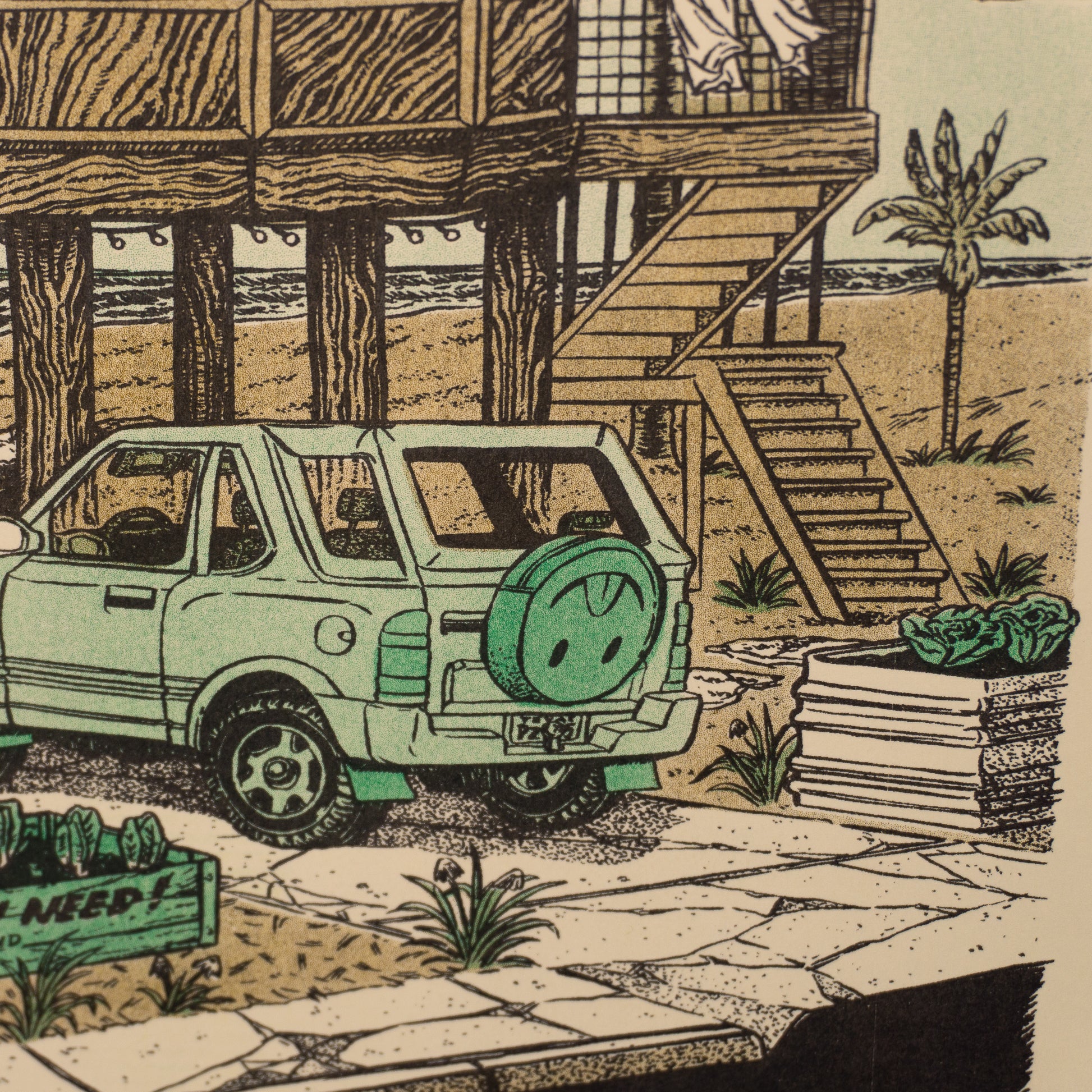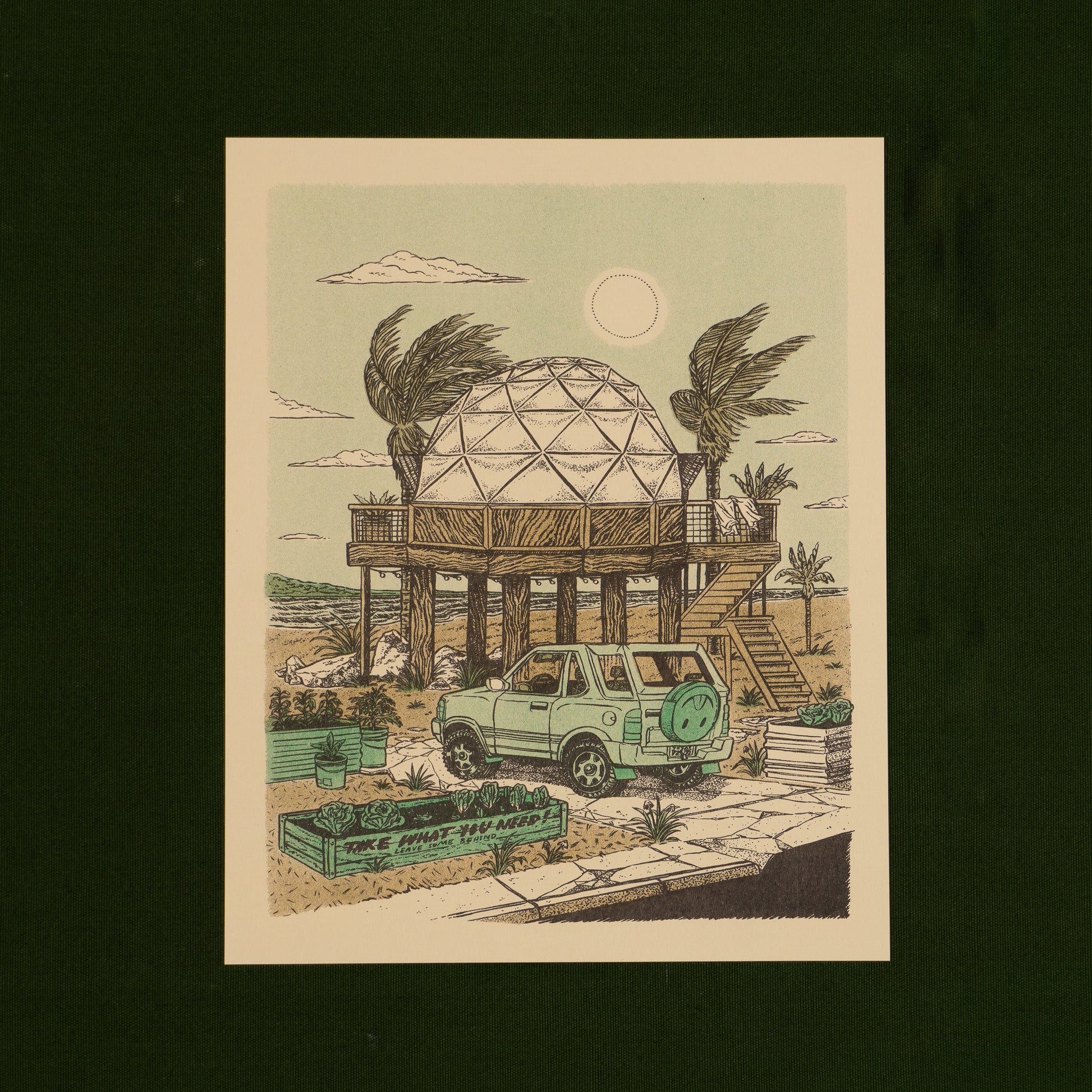 Raised up high in the air, just out of reach of the incoming tides sits a geodesic dome home. Dome-shaped buildings are known to be more resistant to the high speed winds of hurricanes. Unfortunately domes which are made from conventional materials, "stick-built,' are also prone to leaking at the joints. Let's hope these folks have some nice, well sealed joints. On the breezy Saturday afternoon illustrated here all is well: The Amigo is parked in the drive, the tomatoes and greens are thriving and if you amble down the sidewalk you are free to take what you need. Just leave some behind for your others neighbors. Maybe start your own sidewalk veg garden. Heck, grow it in bucket. Who's gonna stop you?