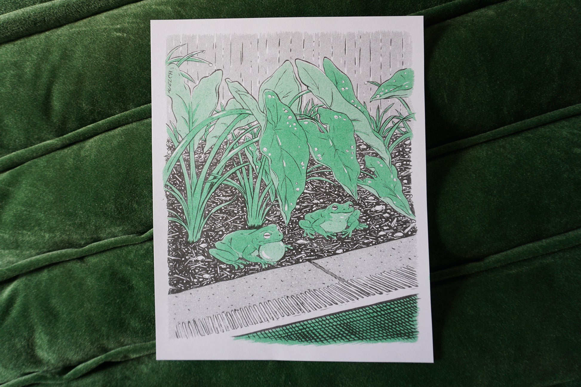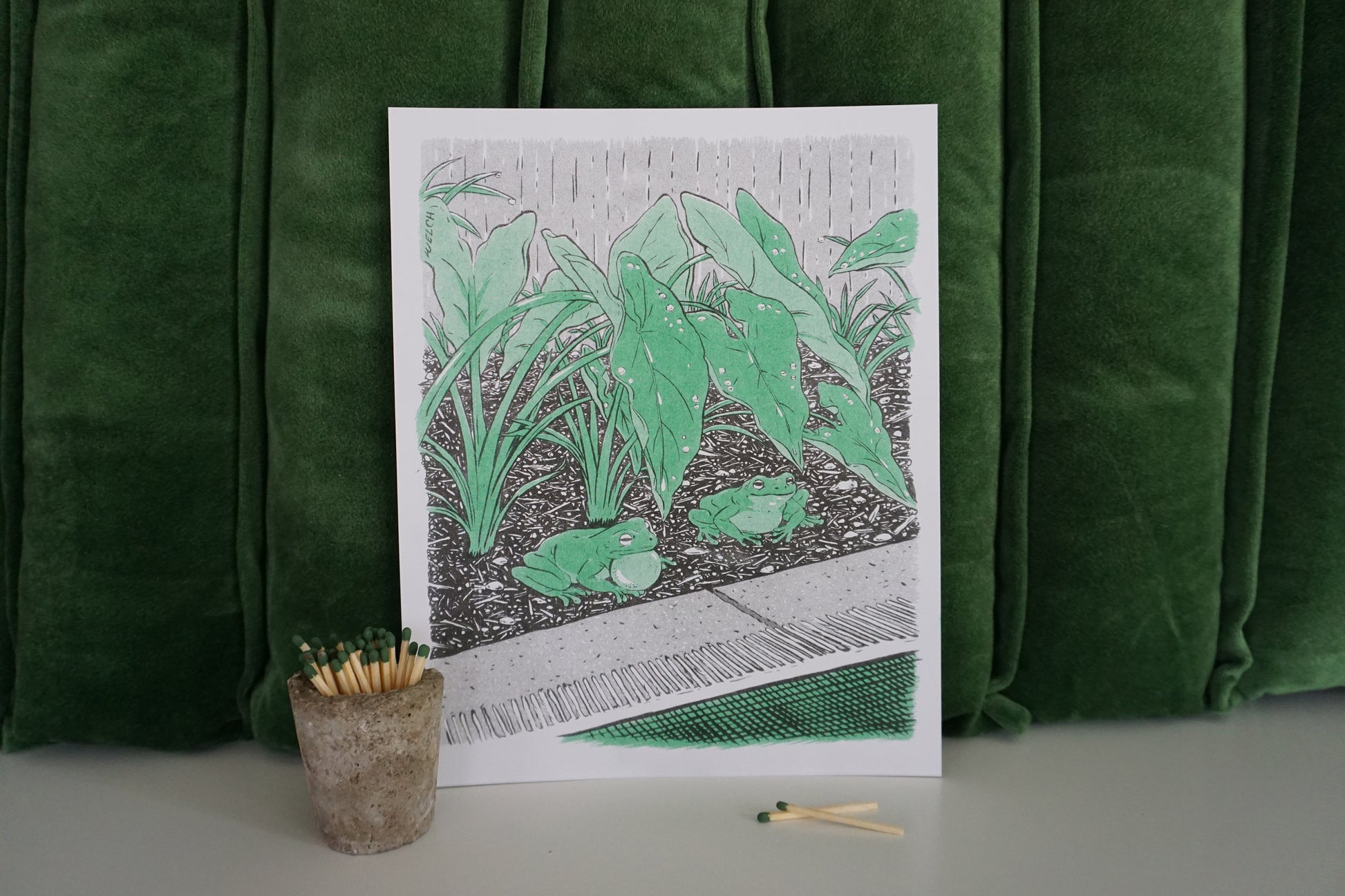 Two frogs approach the liminal space between dirt and the man-made cement patio universe. How do they interpret this space? Unknowable. A soft rain trickles onto alocasia leaves overhead. Our protagonist consider whether to stay put or spring forward into the unknown. Godspeed adventurers.