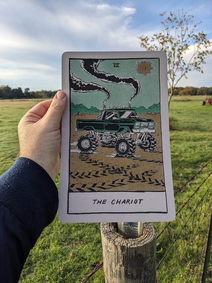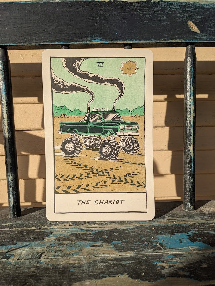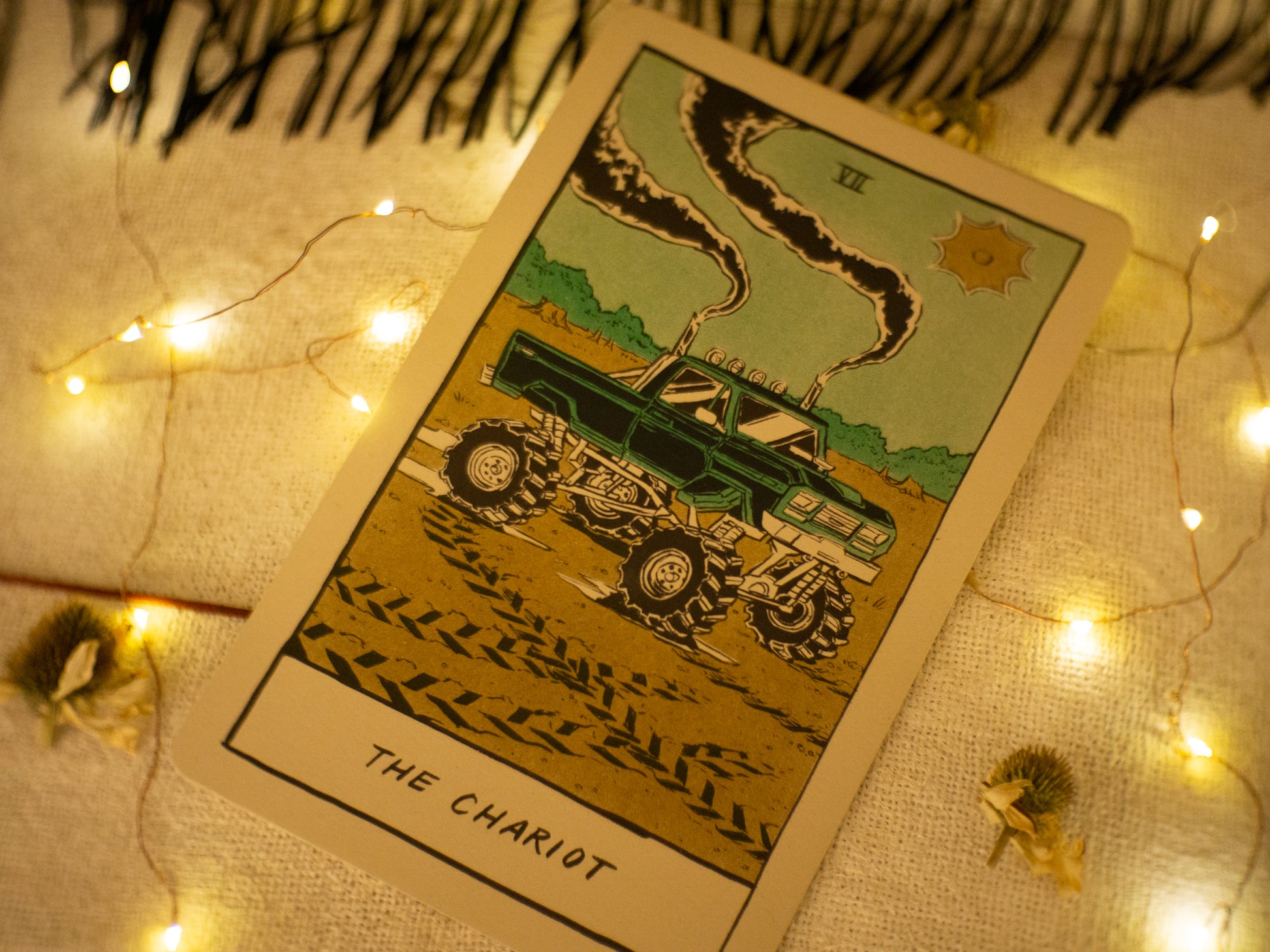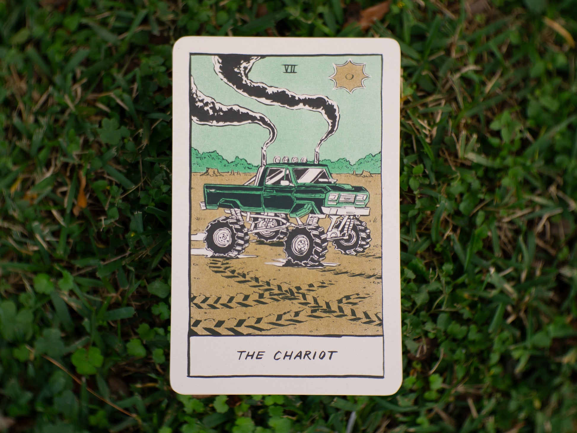 A lifted truck rips through the landscape, rolling coal and alerting everyone in earshot to its arrival. Enter “The Chariot.” The chariot is a card that is sometimes interpreted in terms of will power, force, ambition, and a desire to succeed. Ambition can be a double edged blade: it can reward and do damage simultaneously. Take caution in those big pursuits!