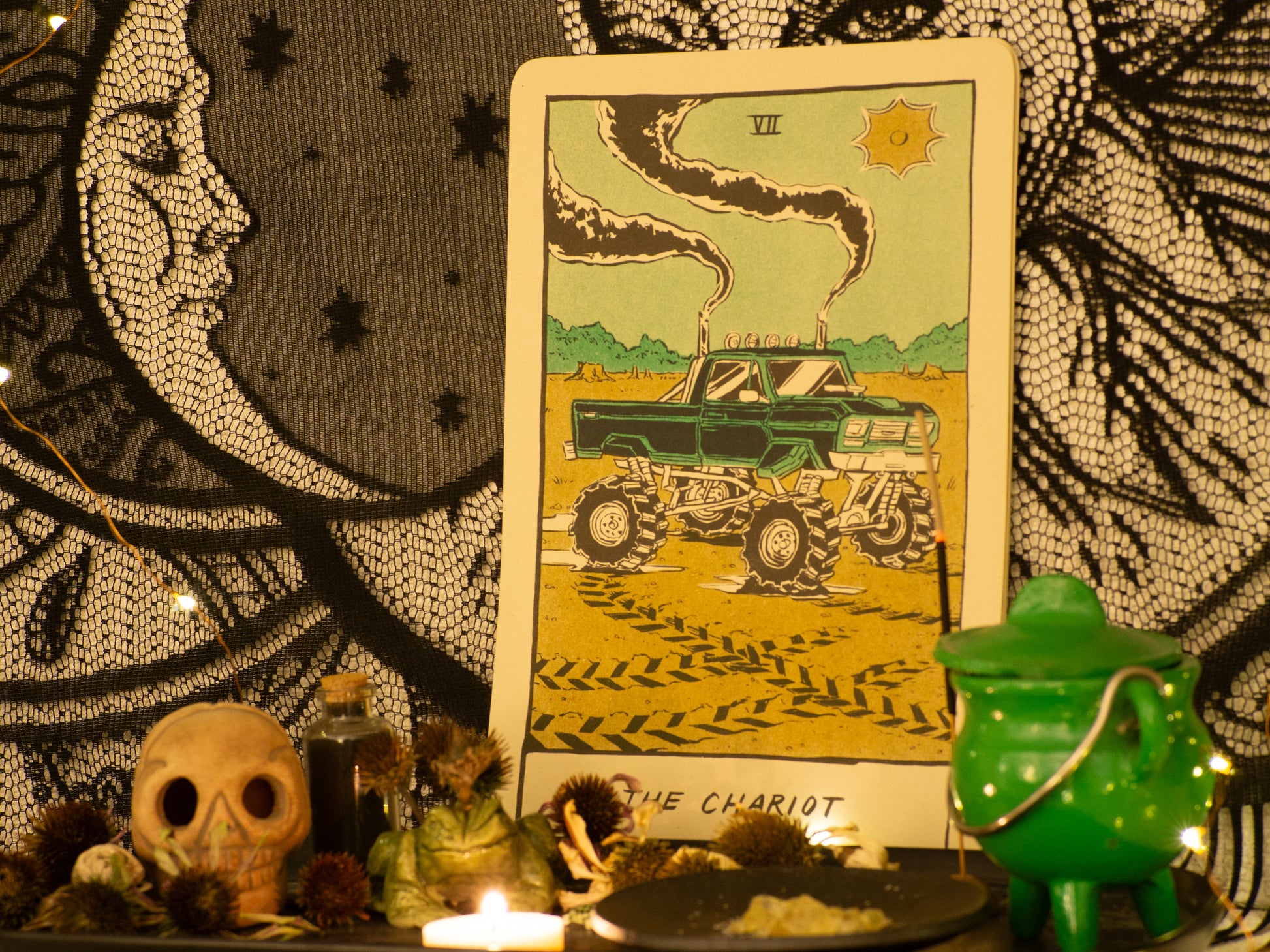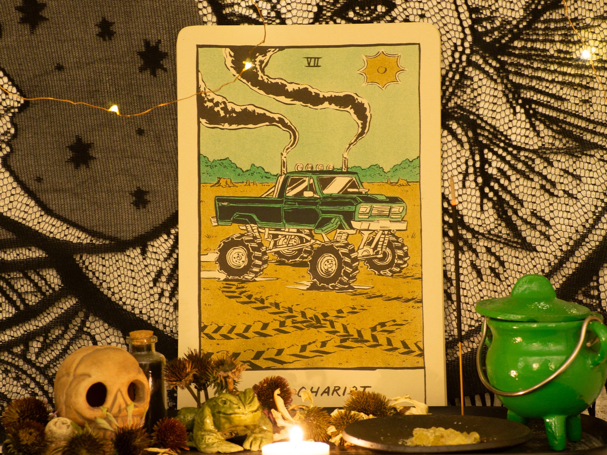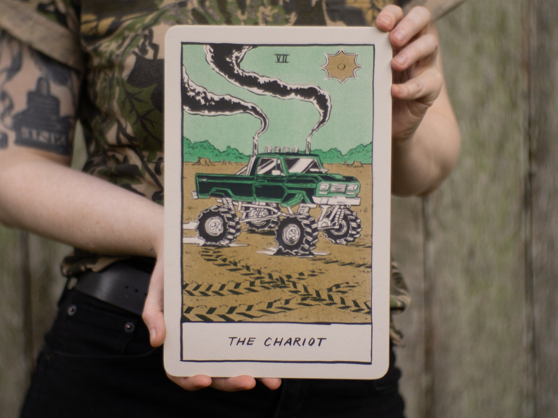 A lifted truck rips through the landscape, rolling coal and alerting everyone in earshot to its arrival. Enter “The Chariot.” The chariot is a card that is sometimes interpreted in terms of will power, force, ambition, and a desire to succeed. Ambition can be a double edged blade: it can reward and do damage simultaneously. Take caution in those big pursuits!
