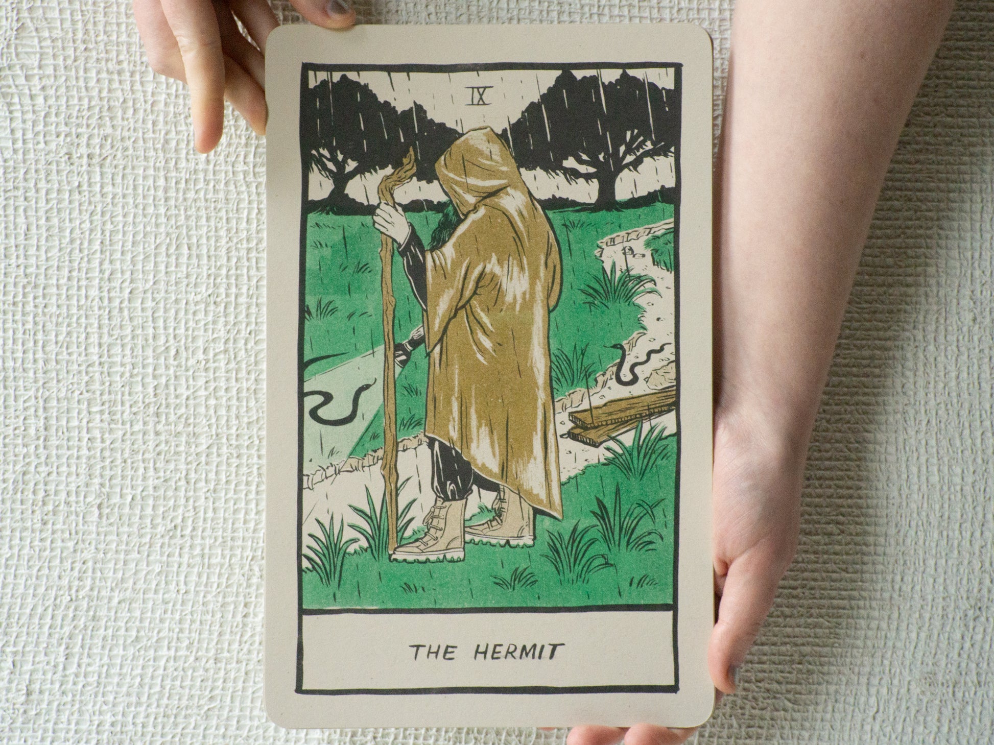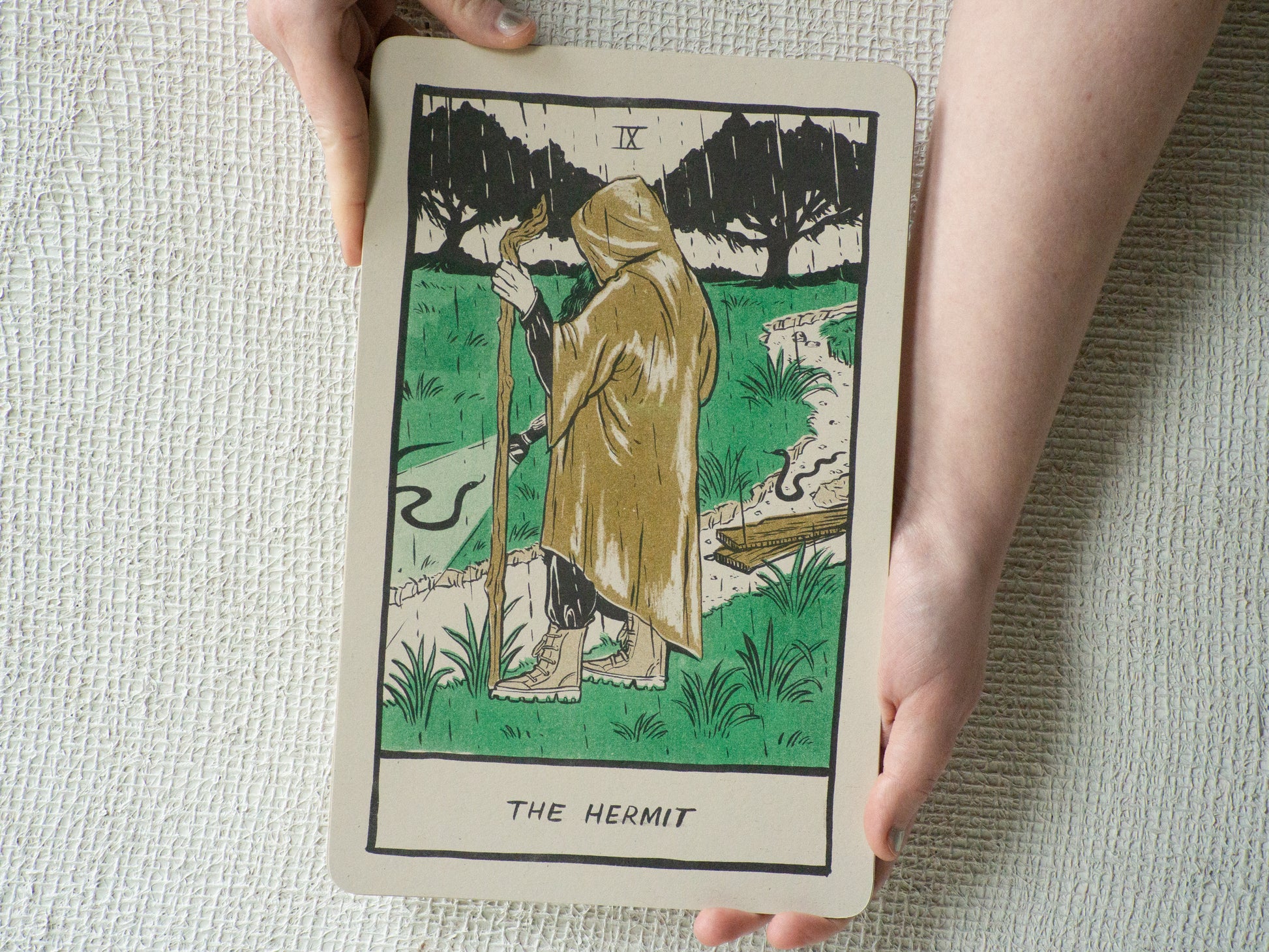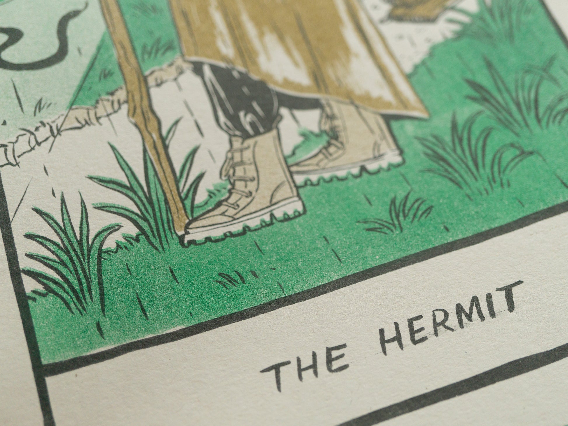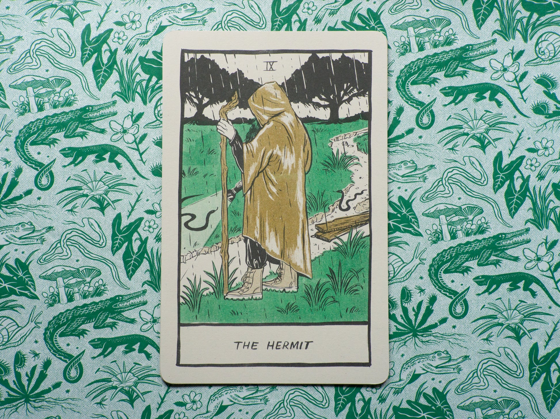 Part of our upcoming Gulf Coast Tarot. The Hermit is a 7″ x 11″ risograph art print with rounded corners. Printed on natural colored paper by French Paper Co.