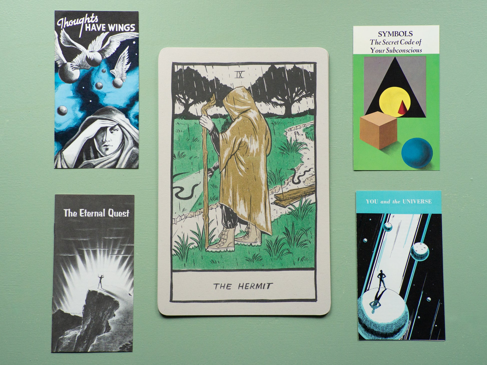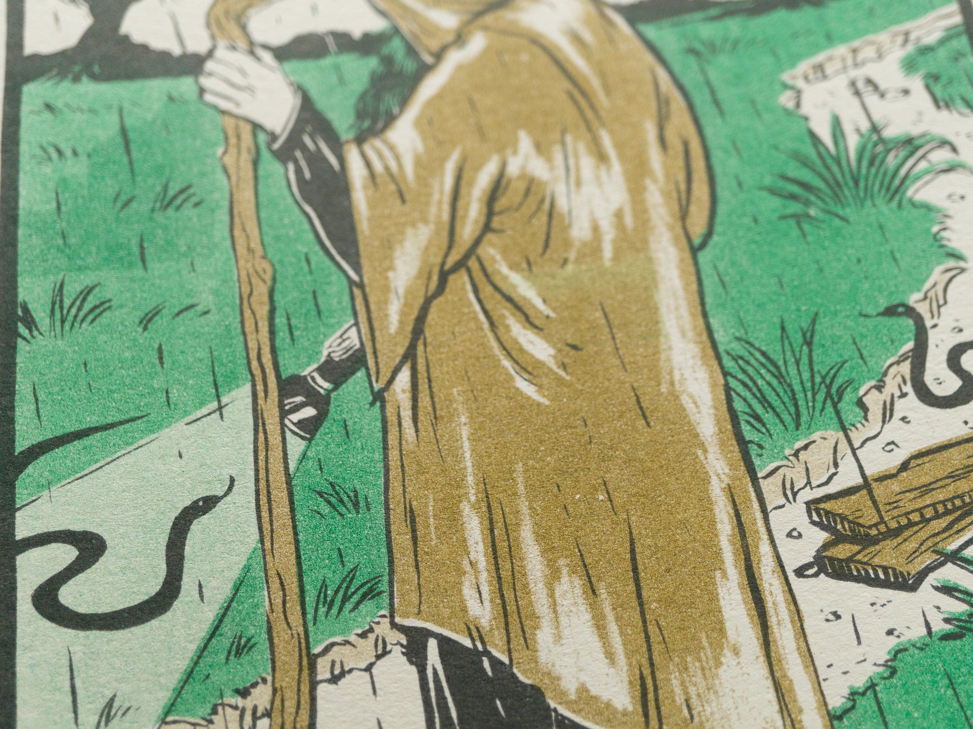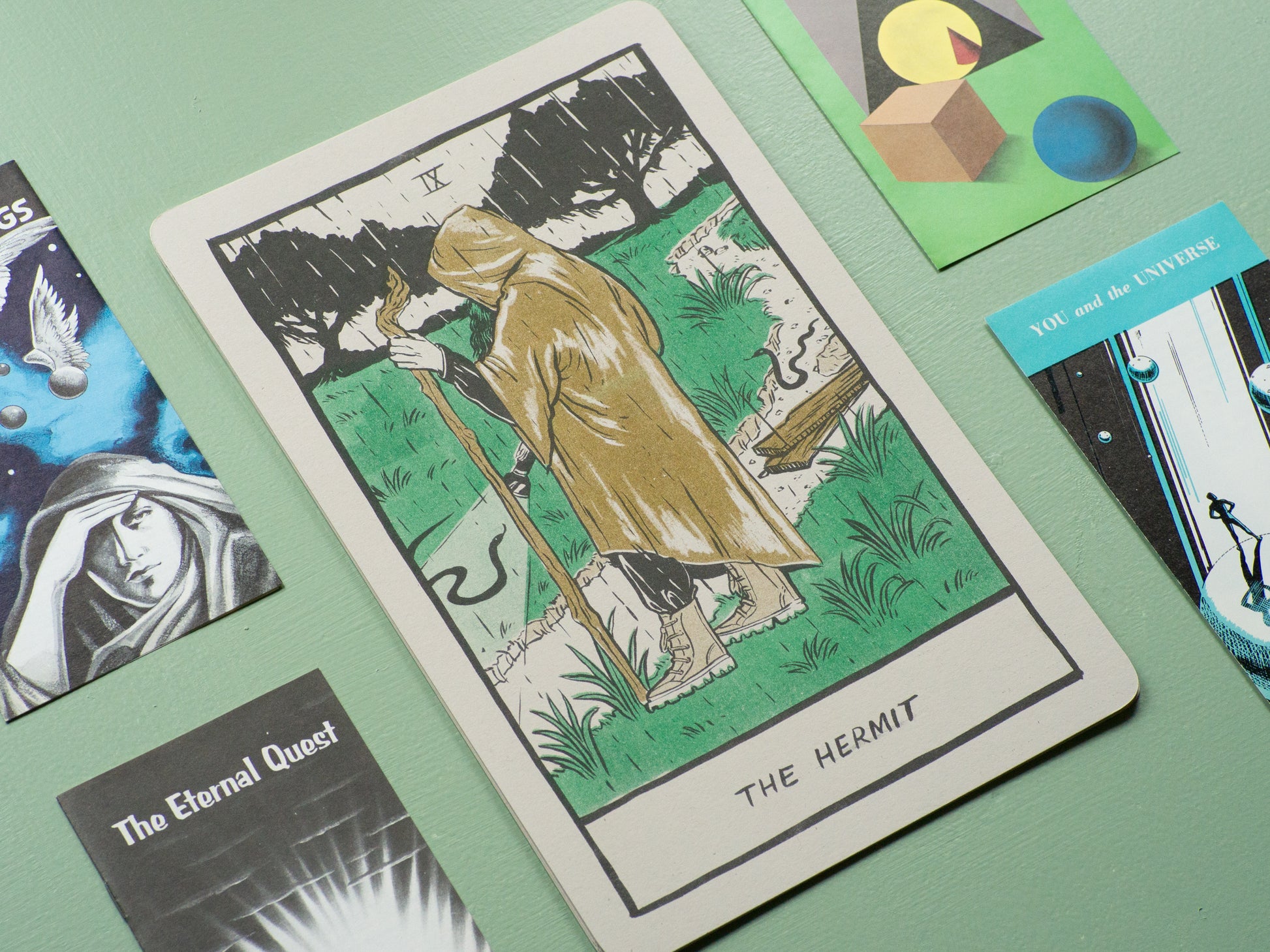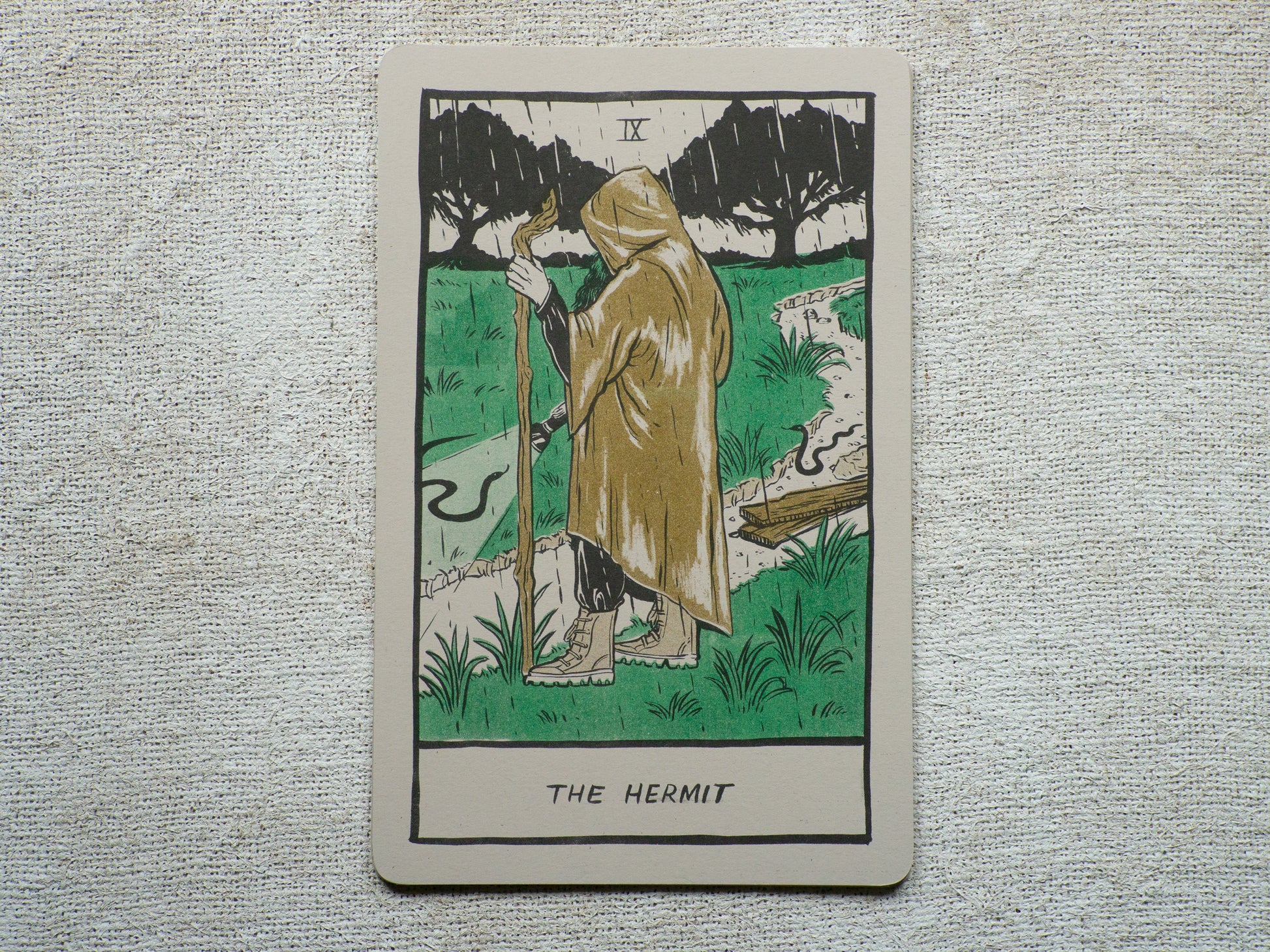 Part of our upcoming Gulf Coast Tarot. The Hermit is a 7″ x 11″ risograph art print with rounded corners. Printed on natural colored paper by French Paper Co.
