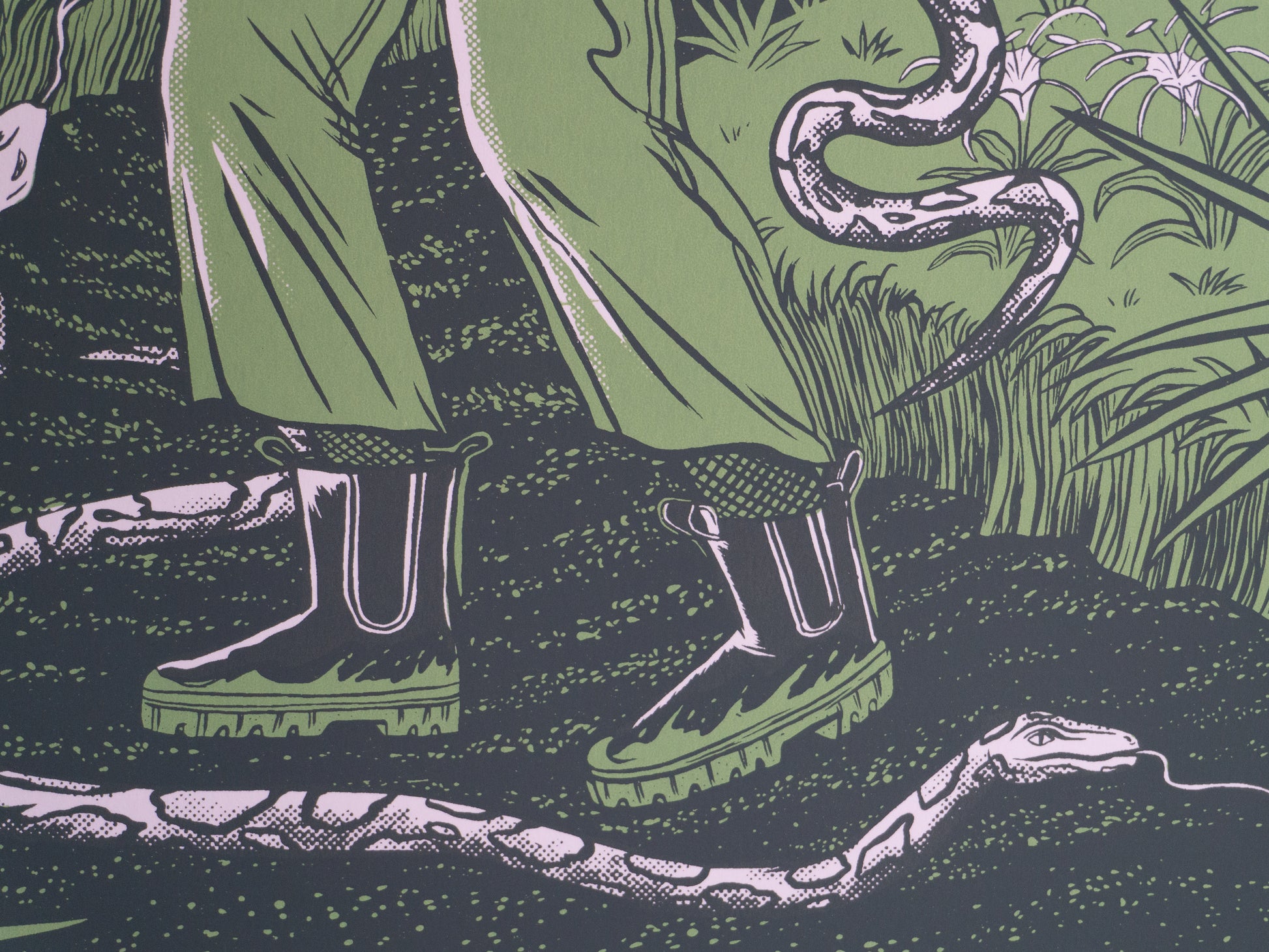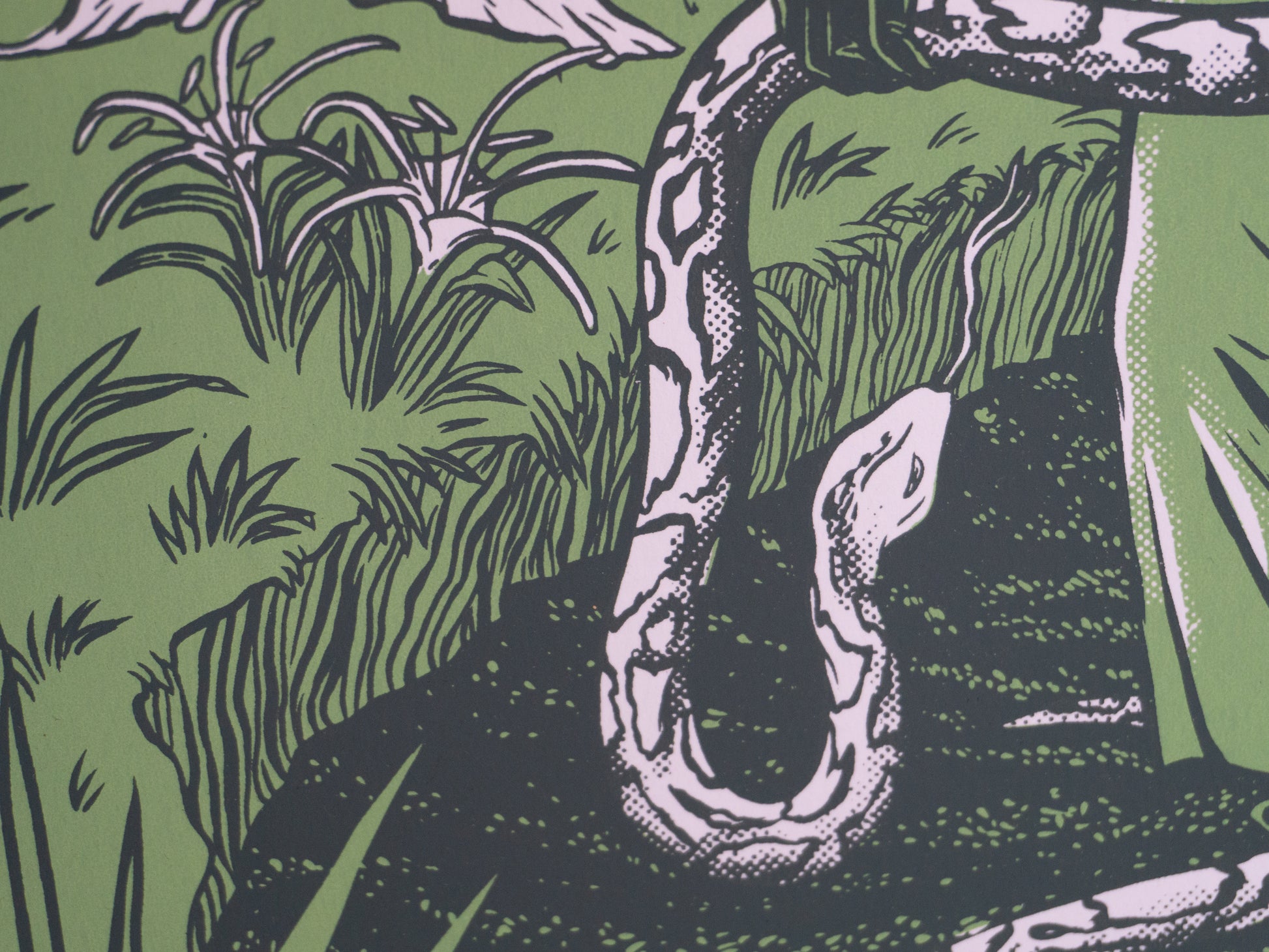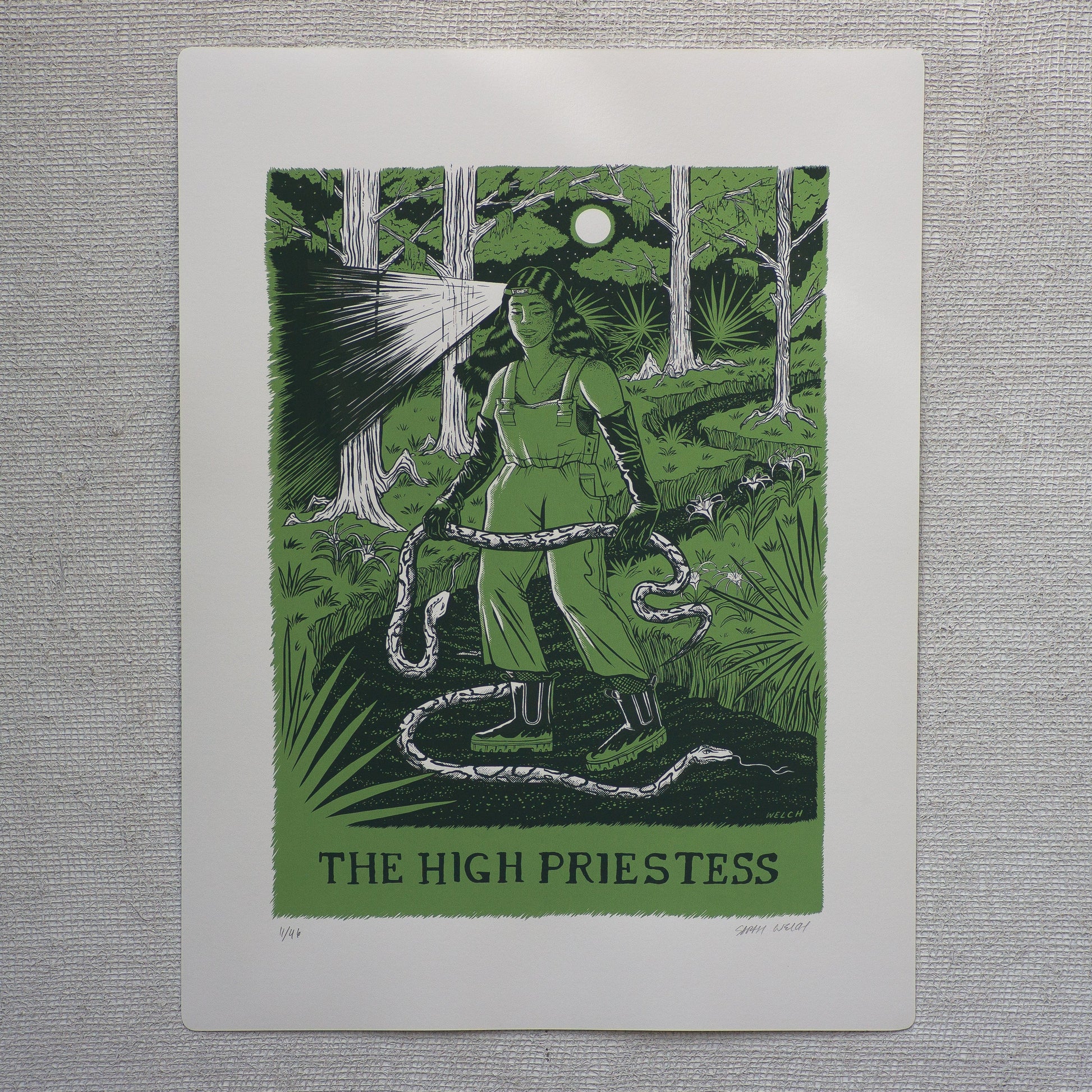 Hand pulled 2 color screen print by Sarah Welch and Mystic Multiples! Measures approximately 18" x 24" with tarot deck inspired rounded corners. Each print is signed and numbered in this edition of 46 prints. Custom colors include a swampy green and dark green keyline.