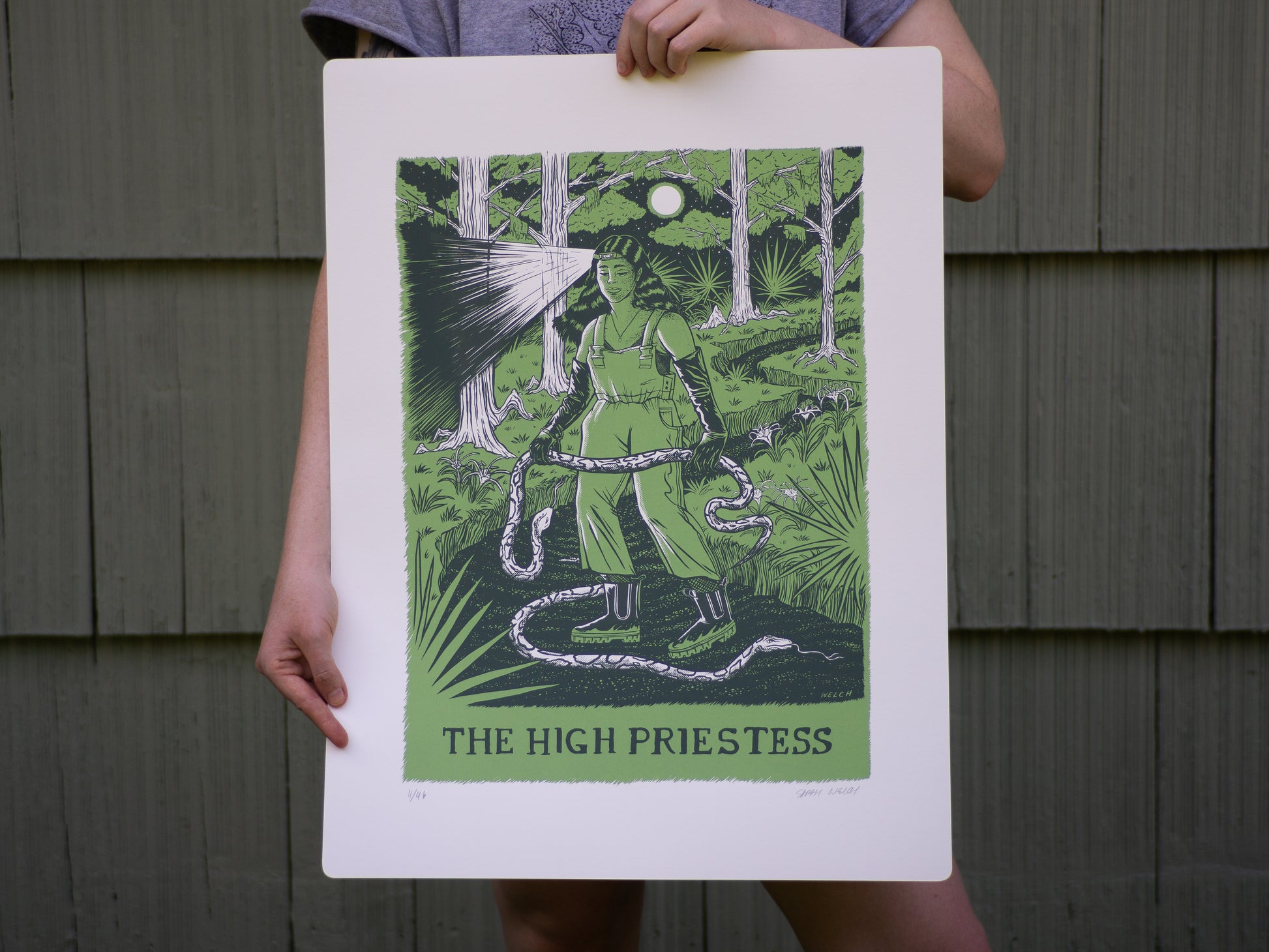 Just the beginning of what will be a very long tarot project. In all her glory this herp-ing high priestess is out in the darkness, among the cypress knees, counting all the creepy crawlies and tracking the ebb and flow of ecological balance. From the Rider Waite Smith deck, the High Priestess card is associated with: Secrets, mystery, the future as yet unrevealed; the woman who interests the Querent, if male; the Querent herself, if female; silence, tenacity; mystery, wisdom, science.