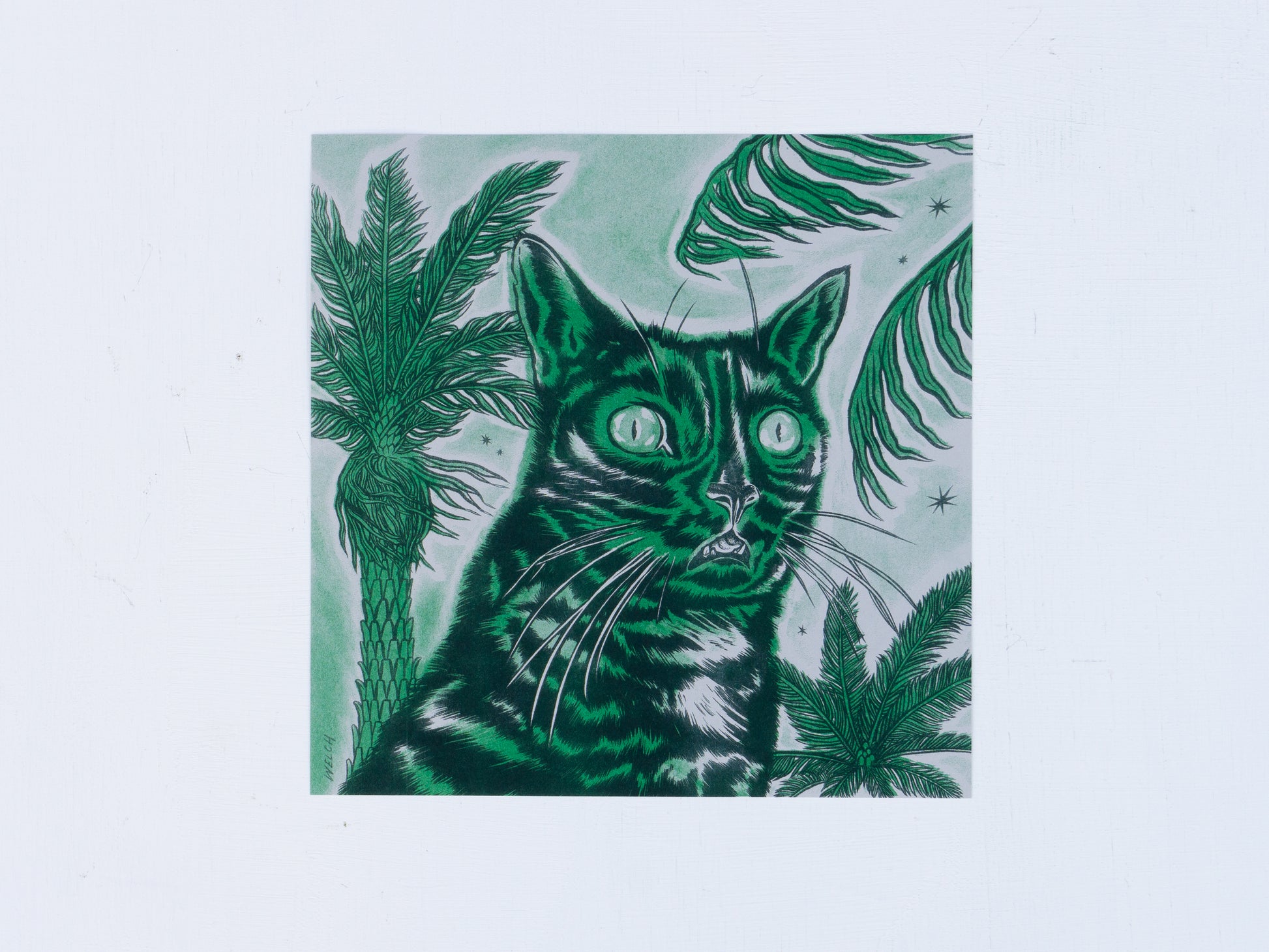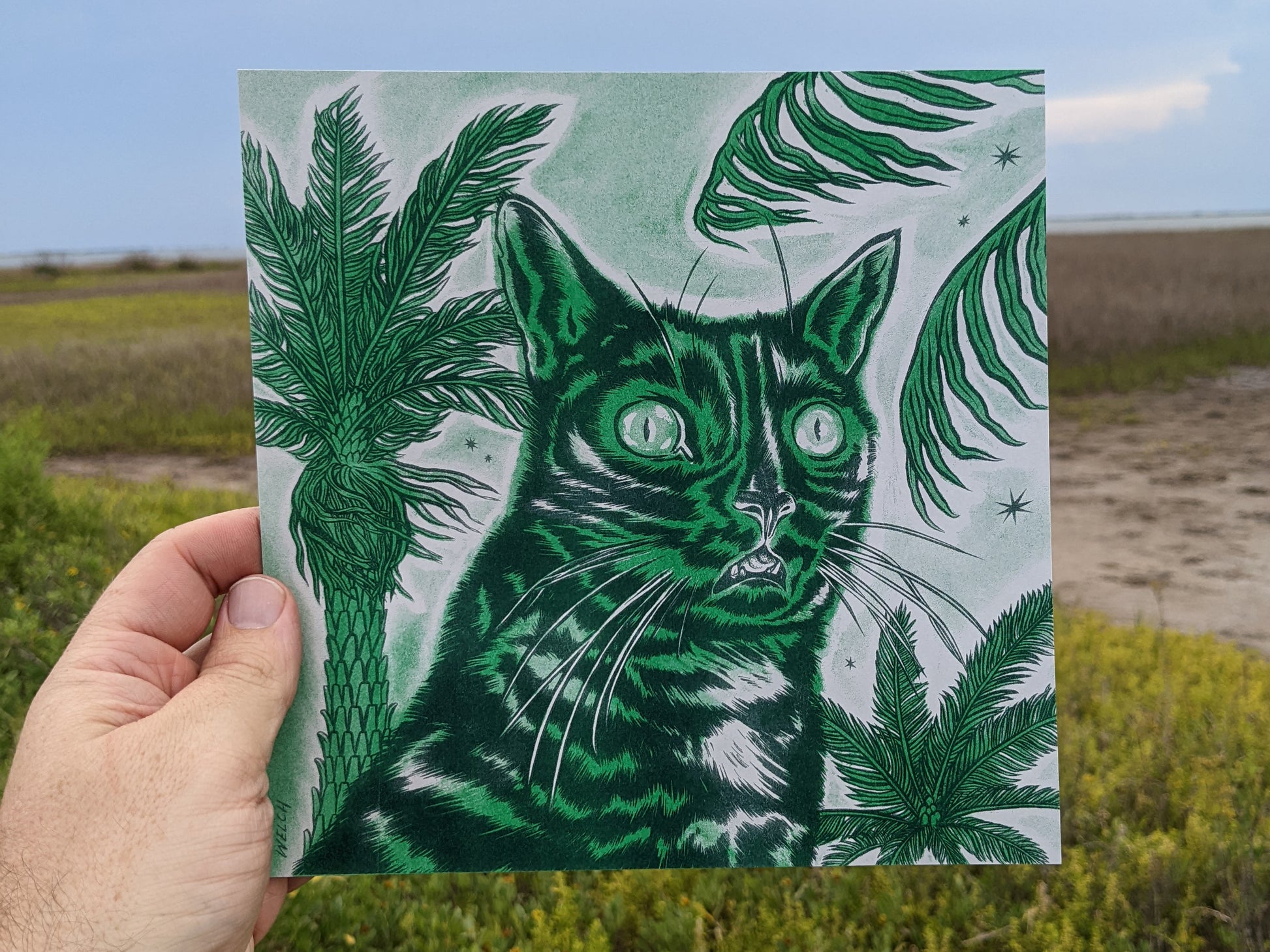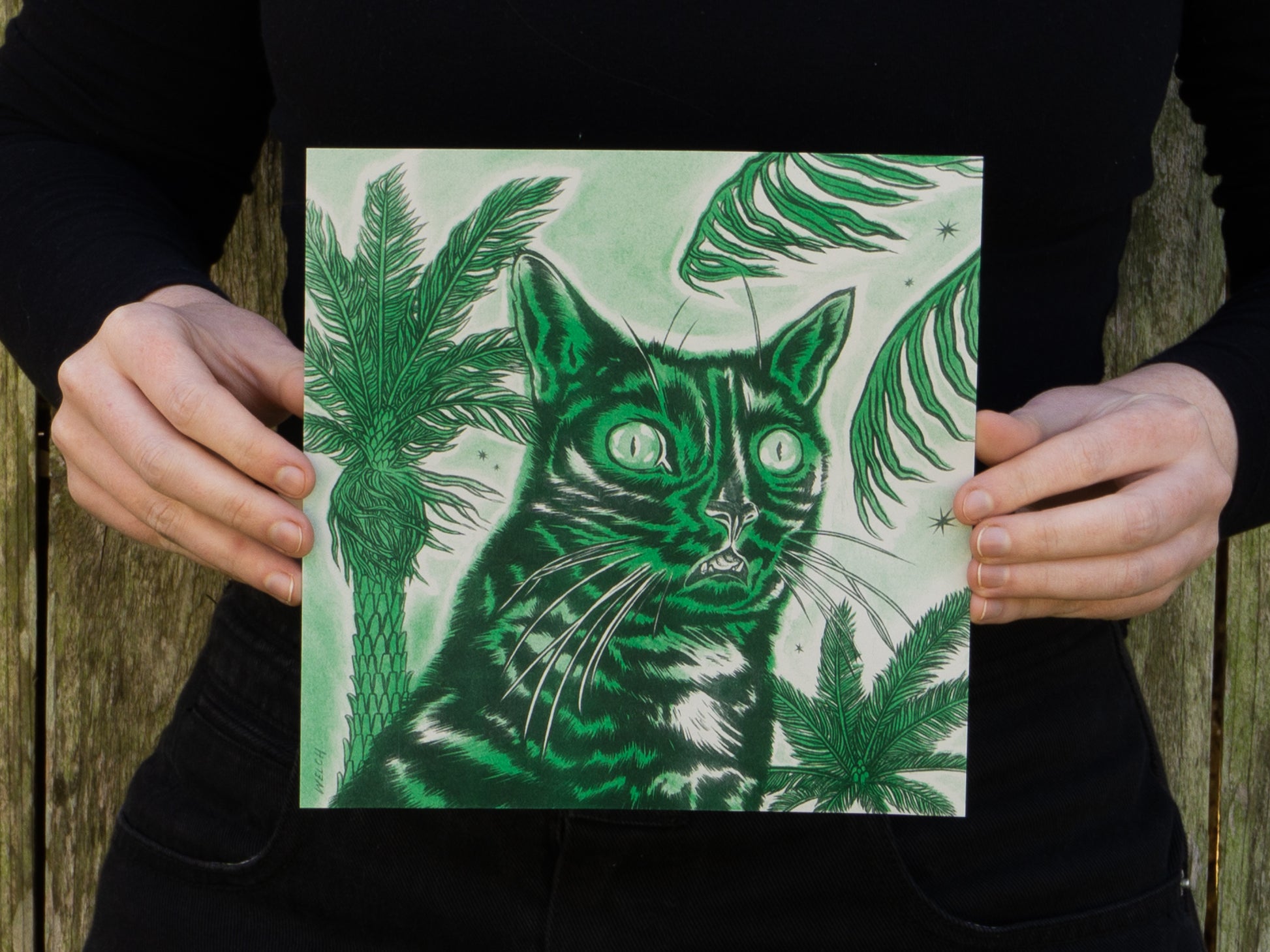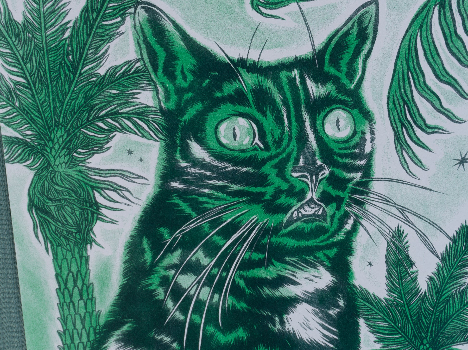 WITNESS is a risograph art print by Sarah Welch and Mystic Multiples. This apocalyptic print shows a black cat awestruck by the events in front of him. Is it the end times? A spiritual awakening? Or something else, like dinner time?