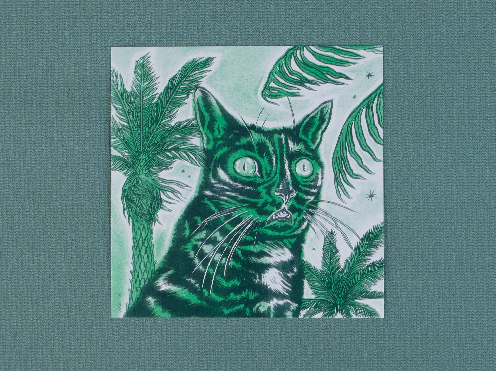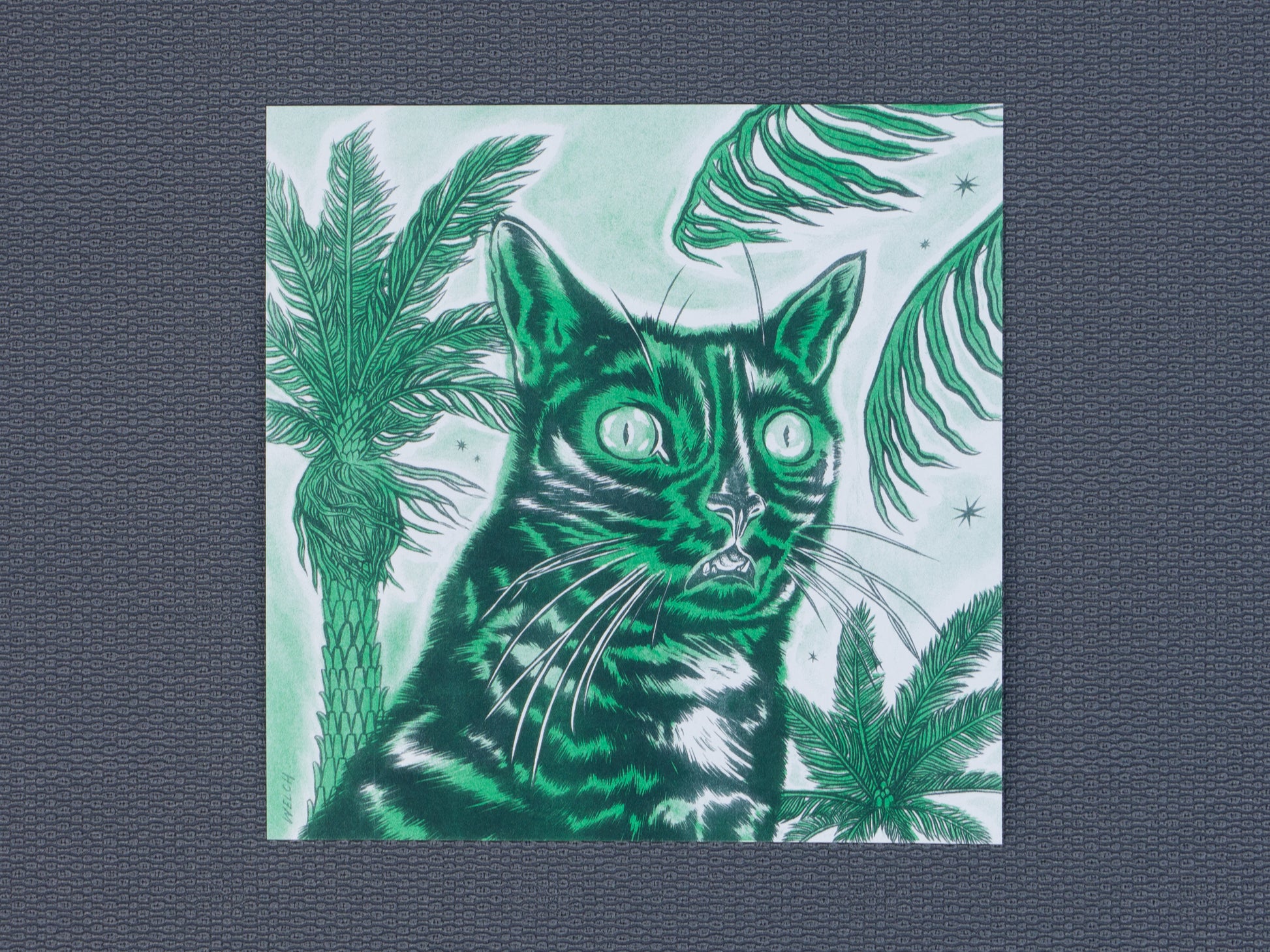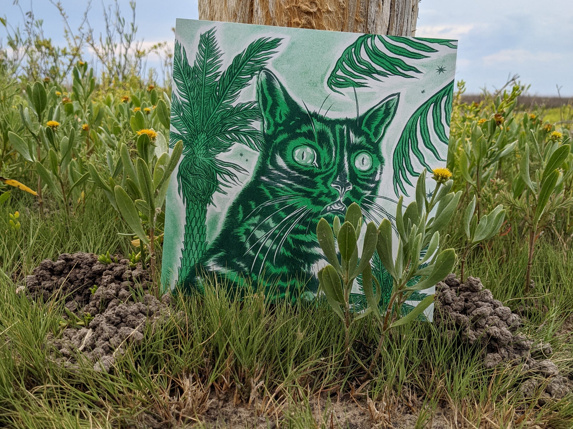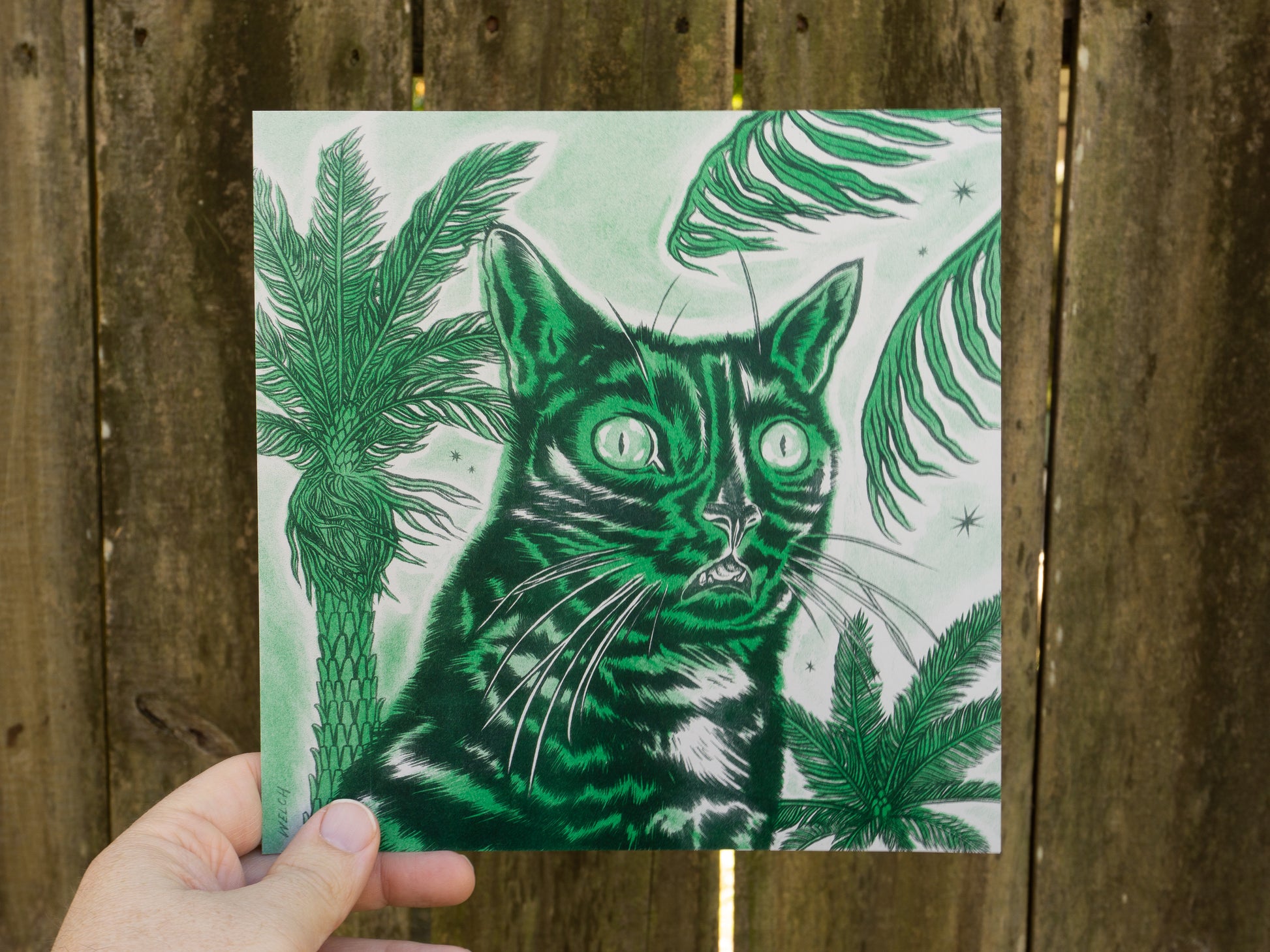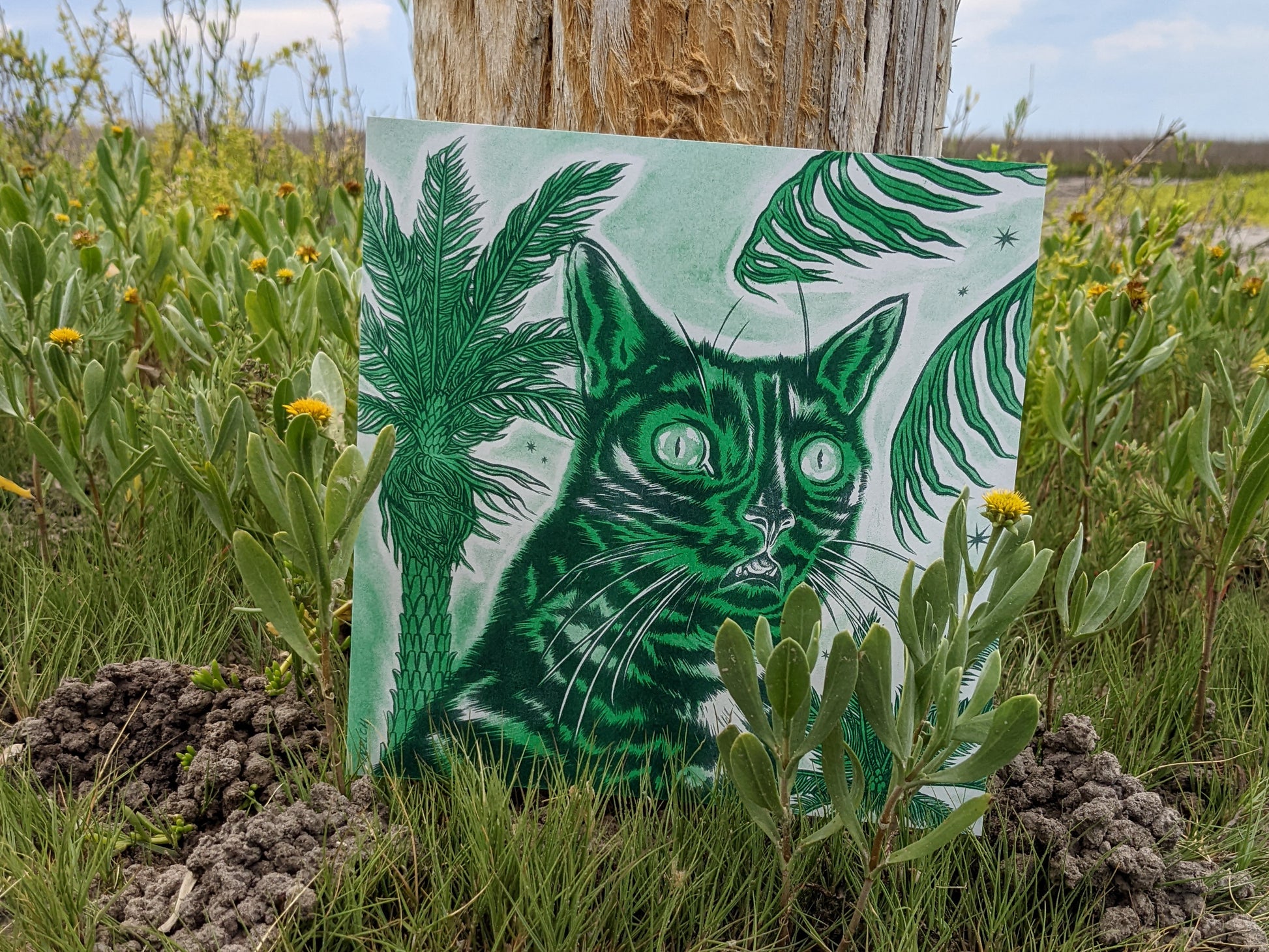 WITNESS is a risograph art print by Sarah Welch and Mystic Multiples. This apocalyptic print shows a black cat awestruck by the events in front of him. Is it the end times? A spiritual awakening? Or something else, like dinner time?