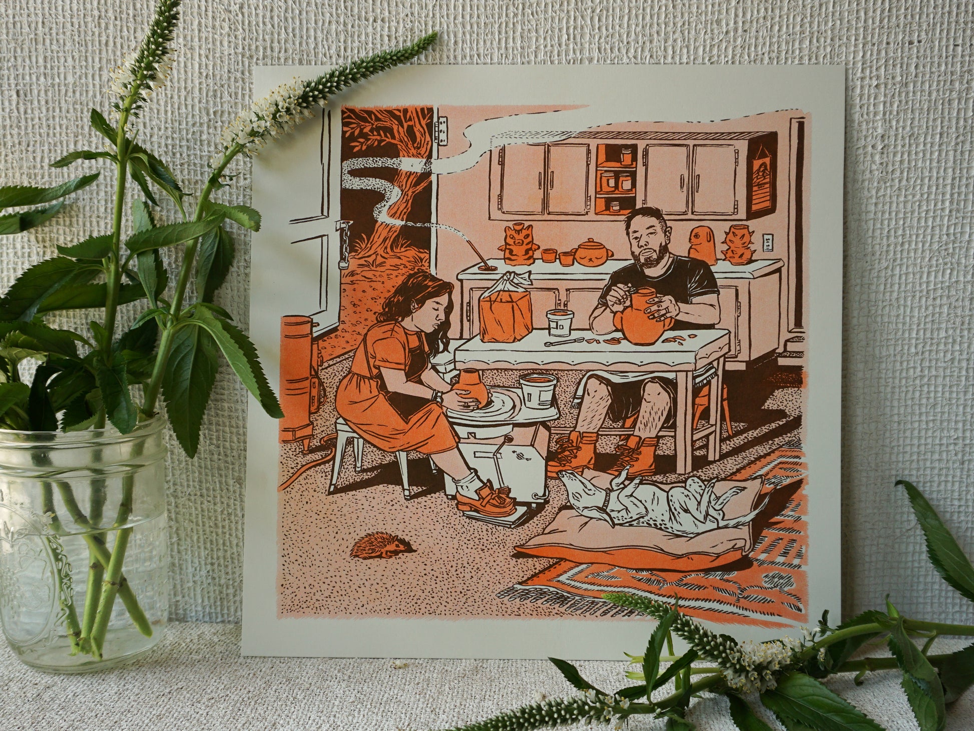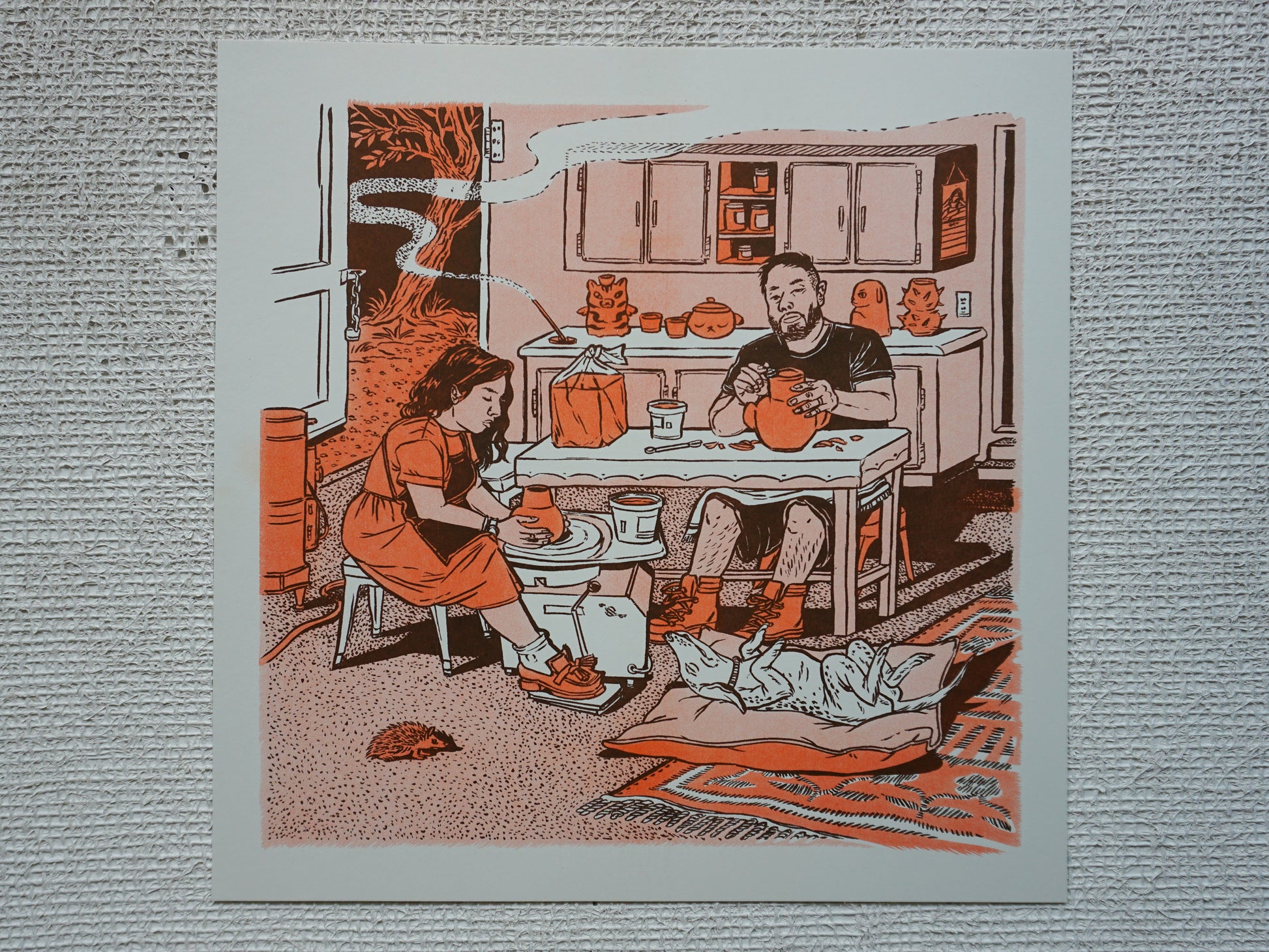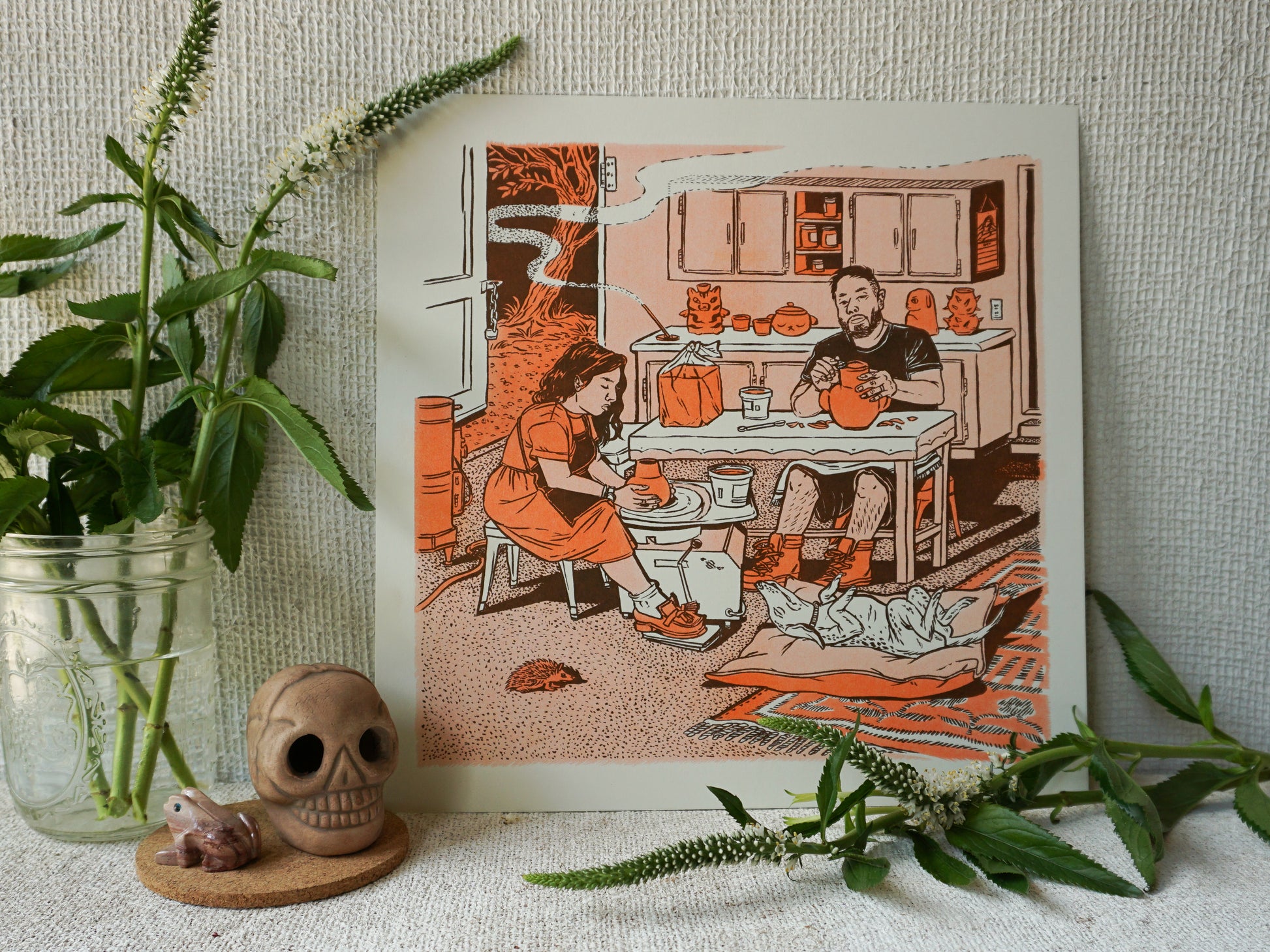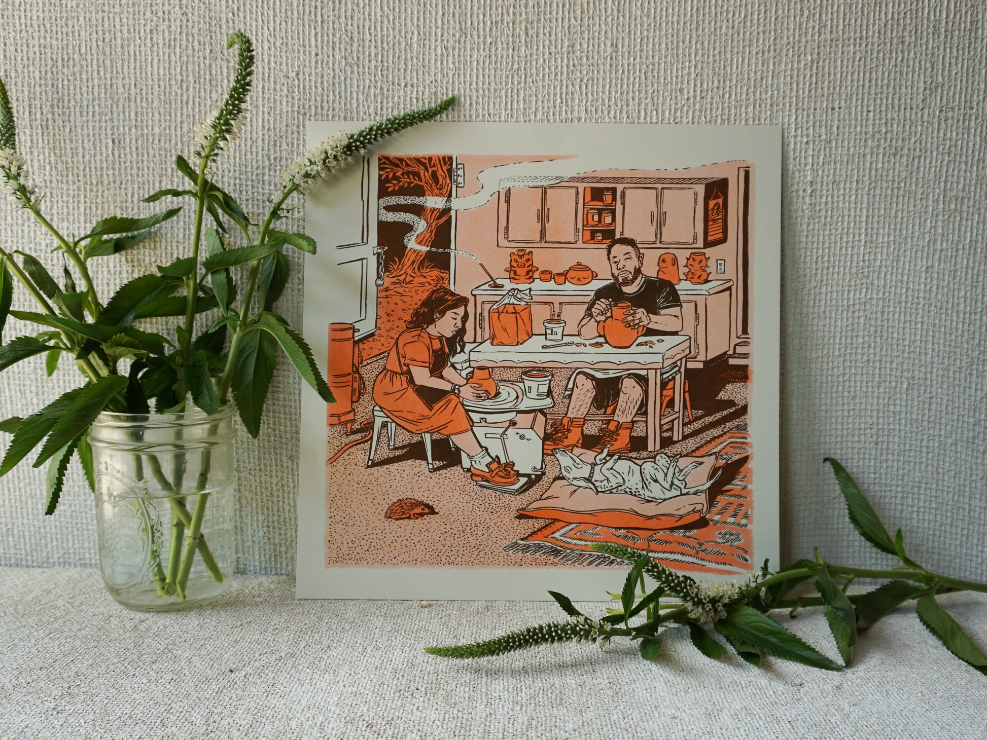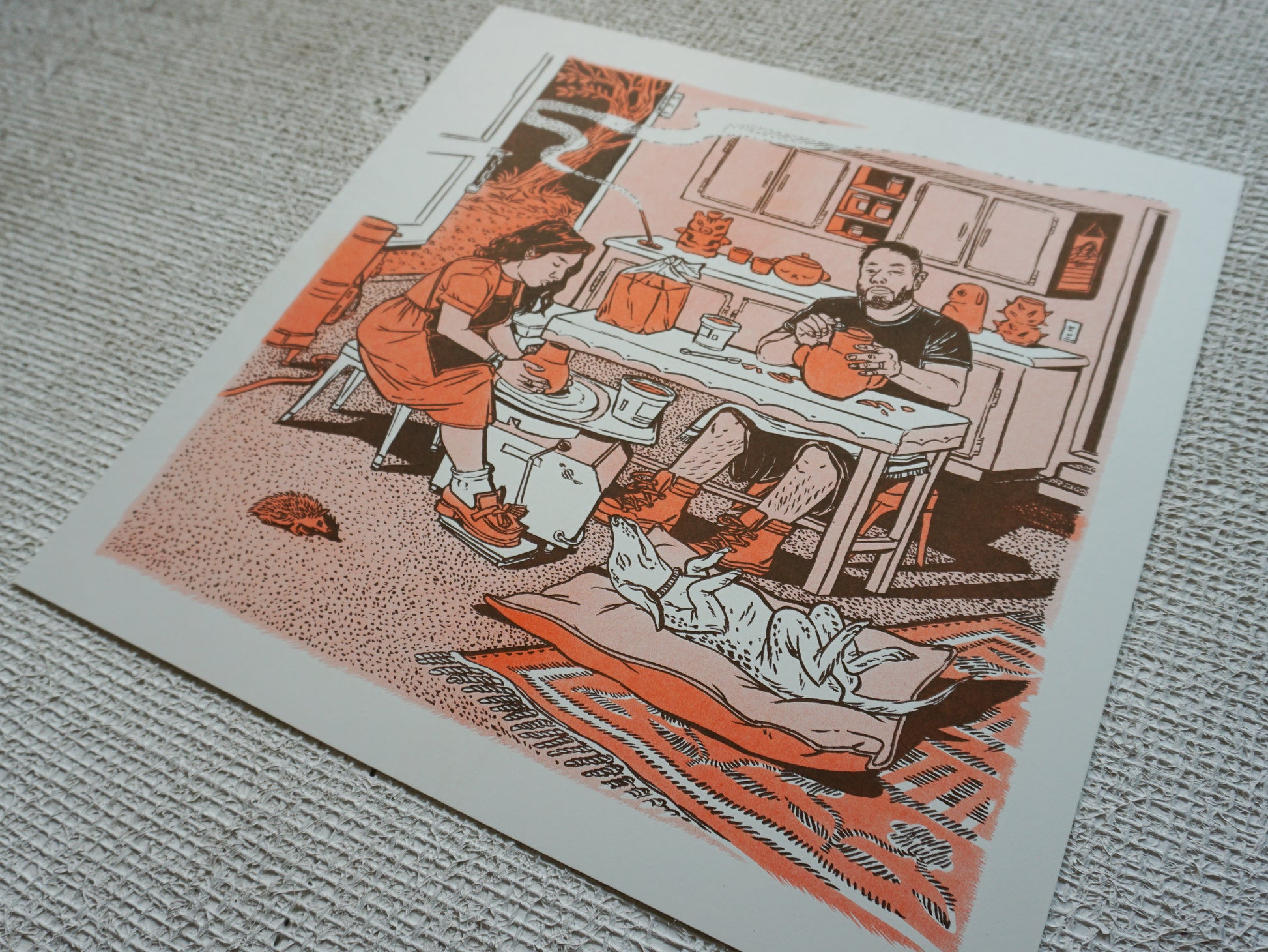 Get down and play in the mud. "Working with Earth" is inspired by a couple of ceramicist friends who built their own clay studio in the garage. It's easy to spend hours and hours working on a clay sculpture, vessel, or even a couple mugs. So what's better than a conveniently located studio? Your itchy dog and hedgehog companion can join. Embracing the earthiness we opted for a peachy orange spot color and rich brown key line. It falls somewhere on the spectrum between 70s home decor and and those Peanut Butter Chocolate candy cups. This image is a little portal of motivation to keep making and growing.