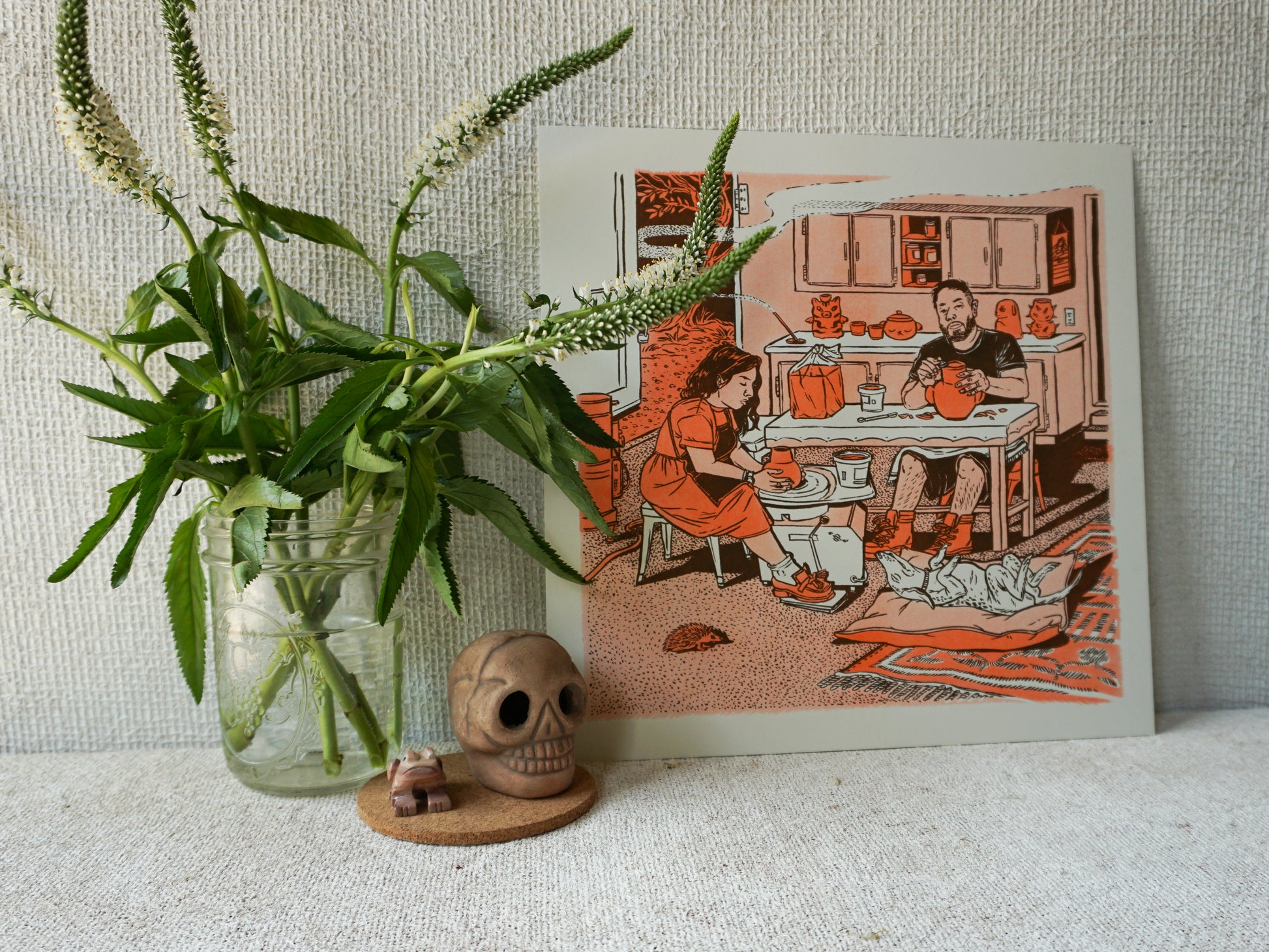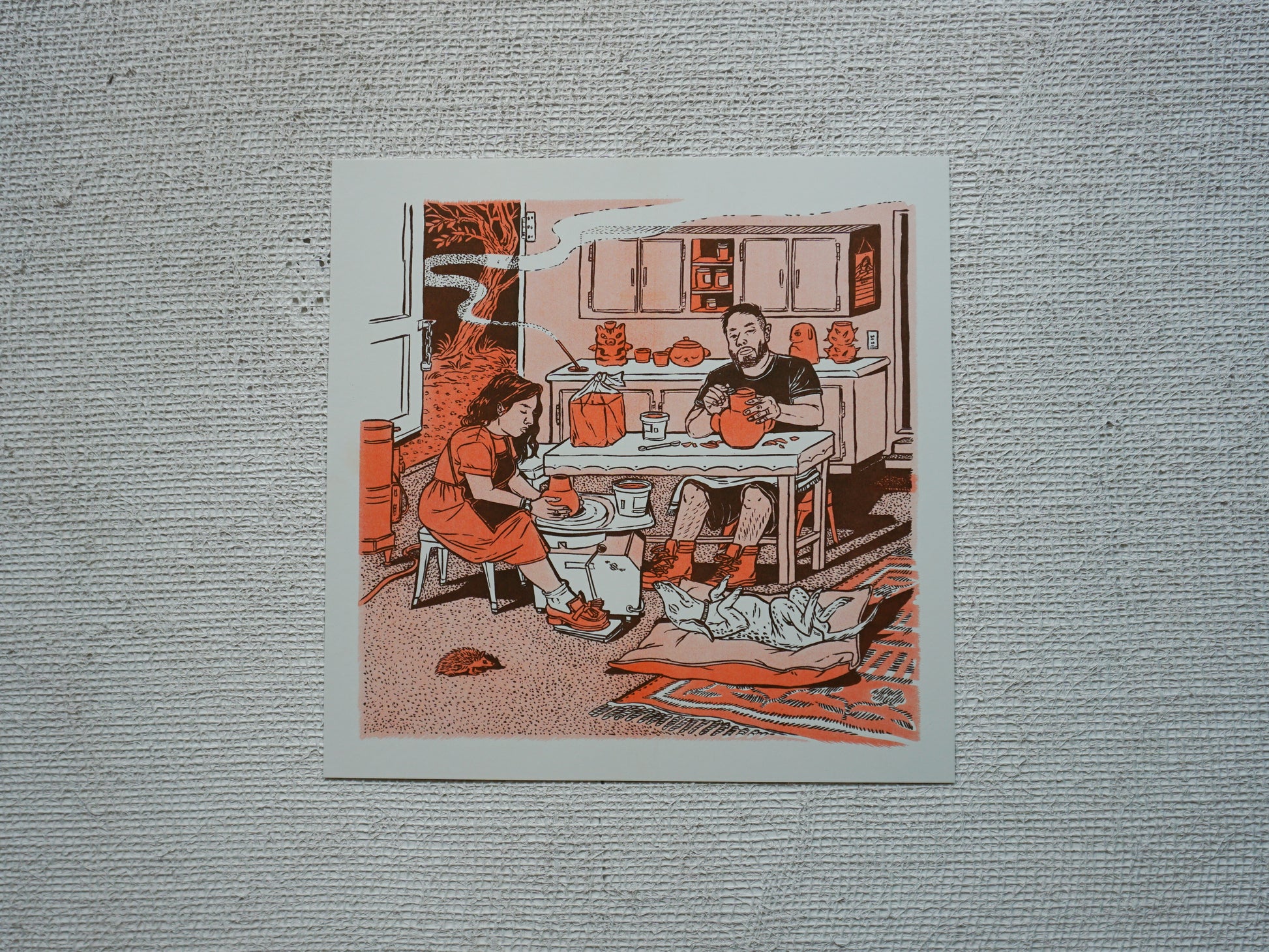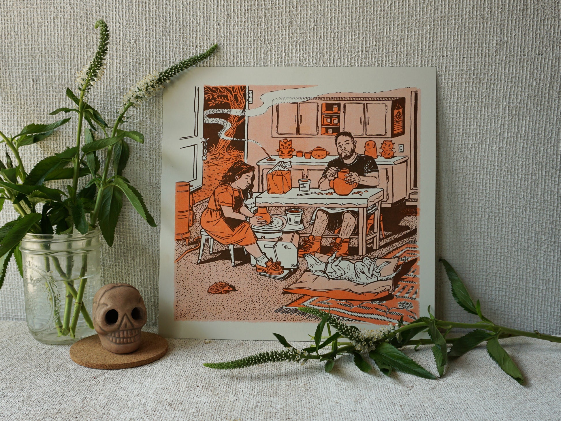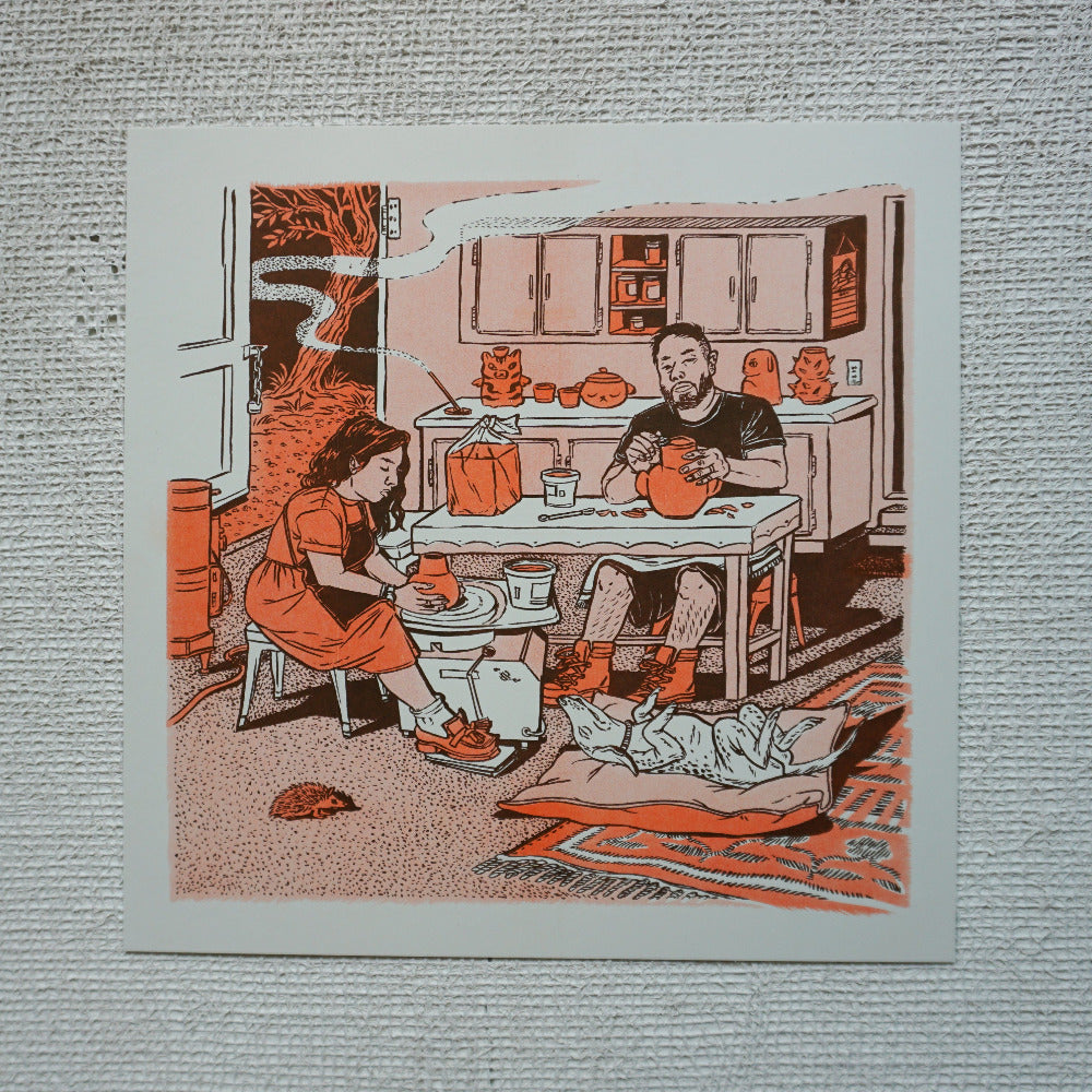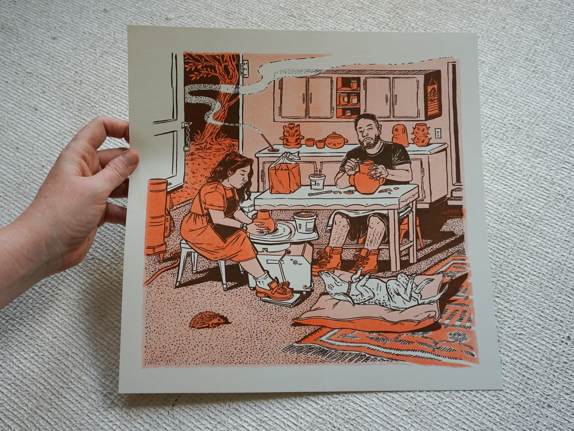 Get down and play in the mud. "Working with Earth" is inspired by a couple of ceramicist friends who built their own clay studio in the garage. It's easy to spend hours and hours working on a clay sculpture, vessel, or even a couple mugs. So what's better than a conveniently located studio? Your itchy dog and hedgehog companion can join. Embracing the earthiness we opted for a peachy orange spot color and rich brown key line. It falls somewhere on the spectrum between 70s home decor and and those Peanut Butter Chocolate candy cups. This image is a little portal of motivation to keep making and growing.